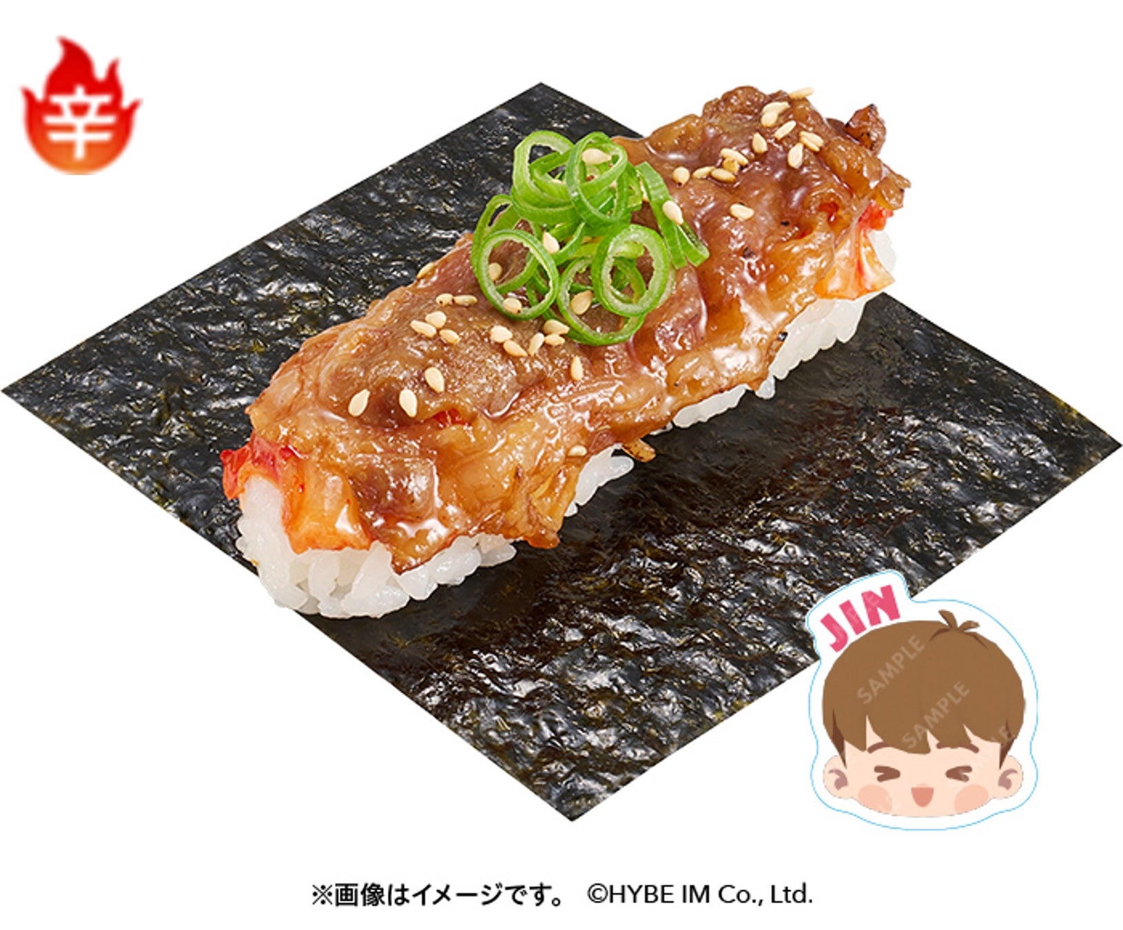 今回のコラボでは、おすしやスイーツをはじめとした複数のコラボ商品が登場します。「ポッサム風にぎり」は「ポッサム」をイメージし、しっとりやわらかく仕上げた豚肉の表面を軽く炙り、アクセントにピリ辛の焼肉のたれをトッピングしました。「ピリ辛キンパ包み」は炭焼きの香ばしさと濃厚な旨みの牛カルビにキムチを合わせ、ねぎとごまをトッピングすることで「キンパ」風に仕上げました。おすしにはコラボ限定ピック(全14種)が付いてきます。