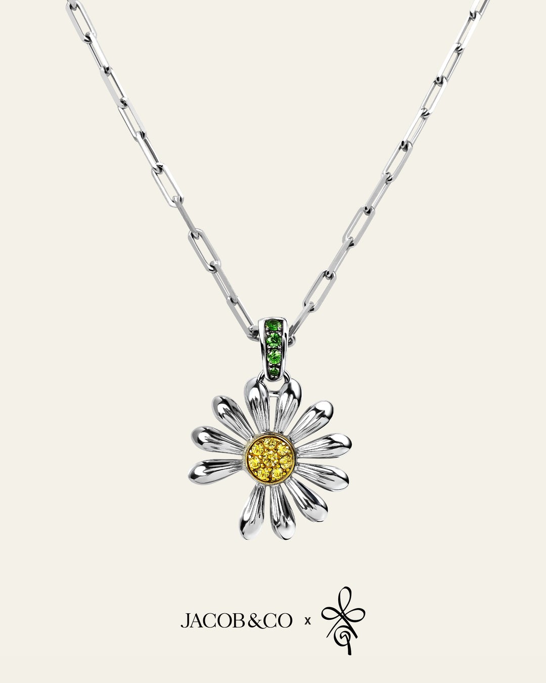 繊細な造形のデイジーに、鮮やかなツァボライトとイエローサファイアが美しくあしらわれ、洗練されたシルバーの輝きとともに、日常使いの中でも確かな個性を主張します。