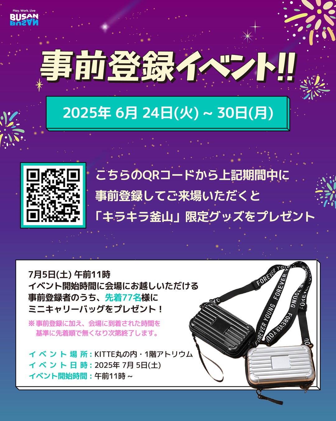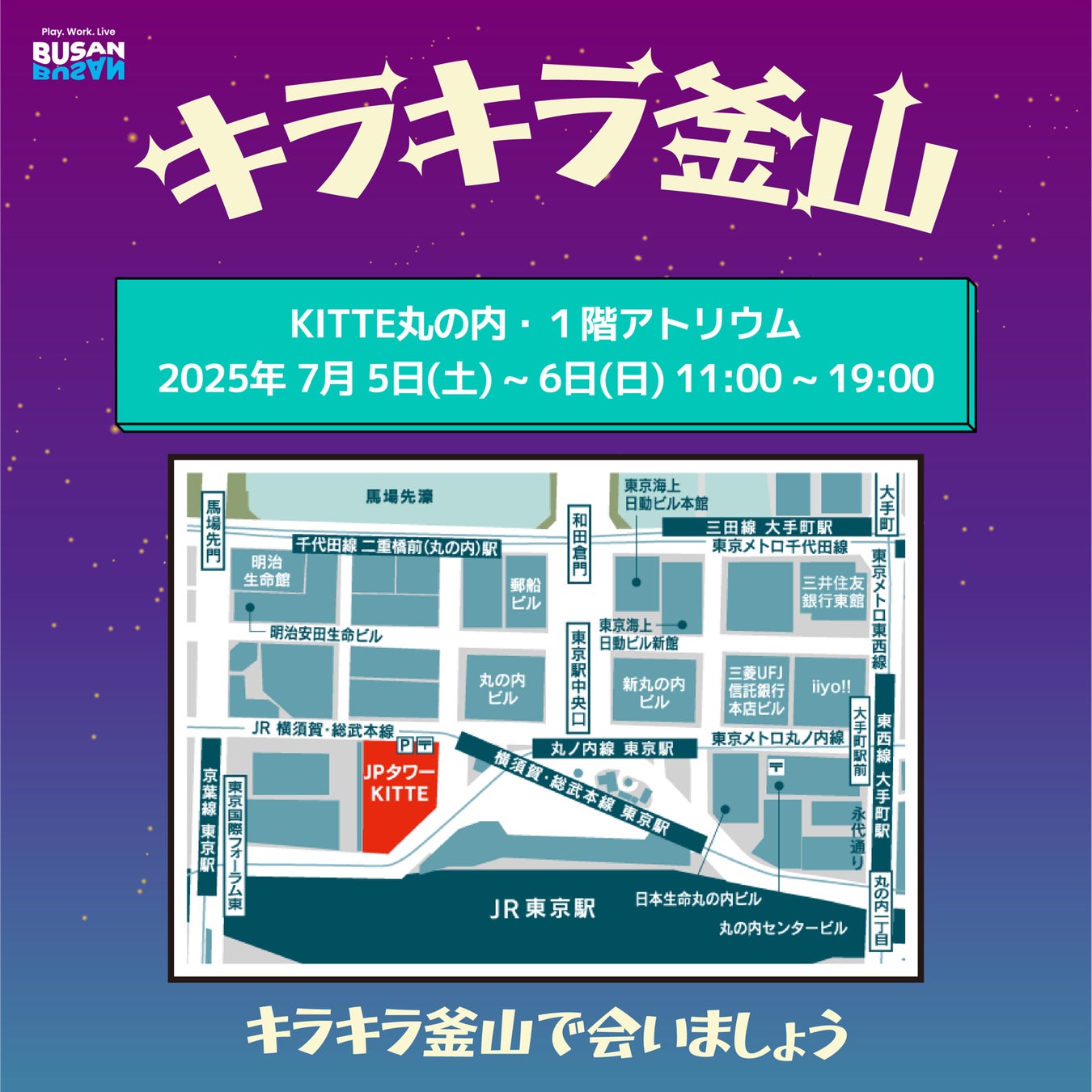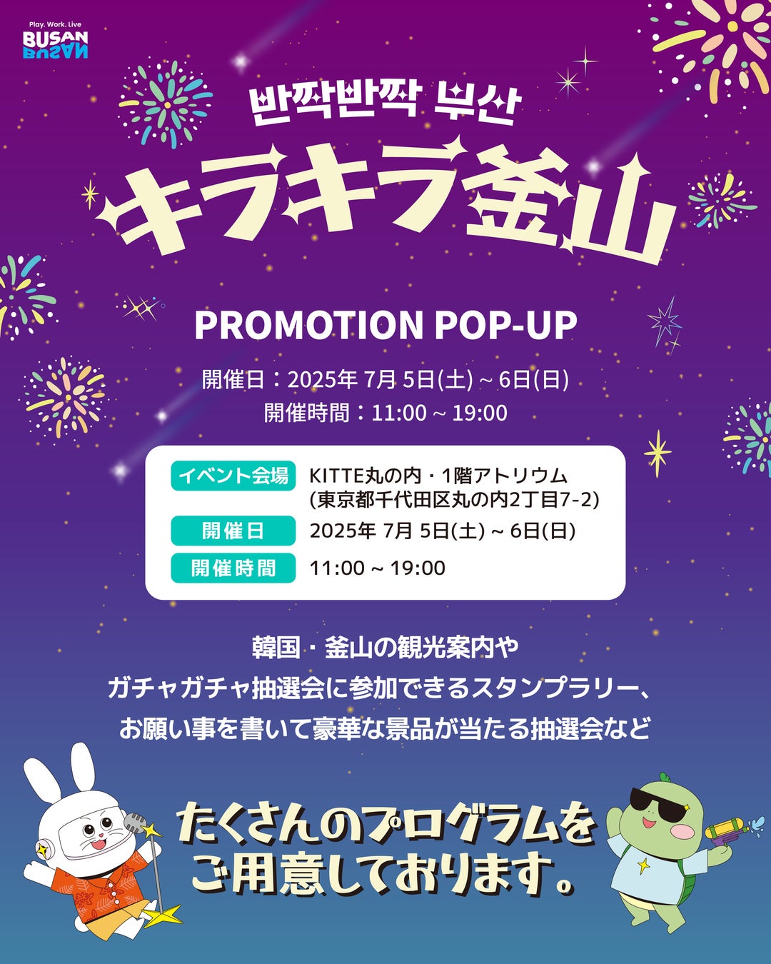 釜山観光公社は、KITTE丸の内1階 アトリウムにて「キラキラ釜山」PROMOTION POP-UPを2025年7月5日(土)から6日(日)までの2日間開催いたします。