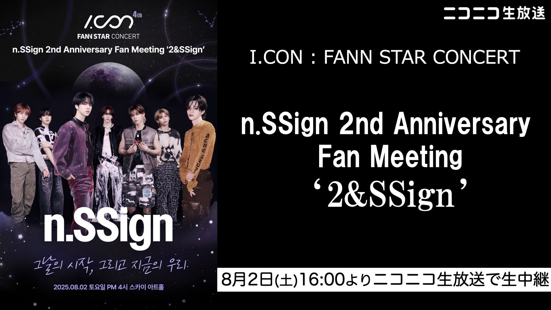 株式会社ドワンゴは、ライブ配信サービス「ニコニコ生放送」にて、8月2日(土)に韓国のソウル・スカイアートホールで行われる『I.CON Concert「n.SSign 2nd Anniversary Fan Meeting “2&SSign”」』を8月2日(土)に日本独占生中継する。
