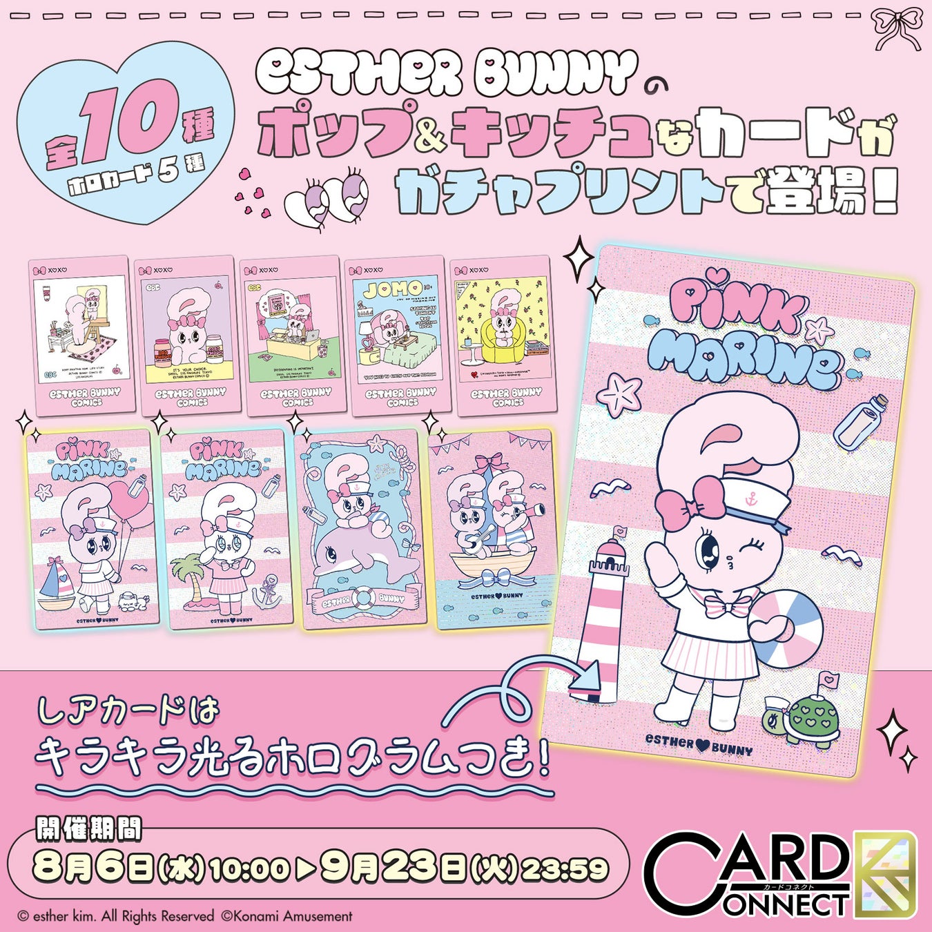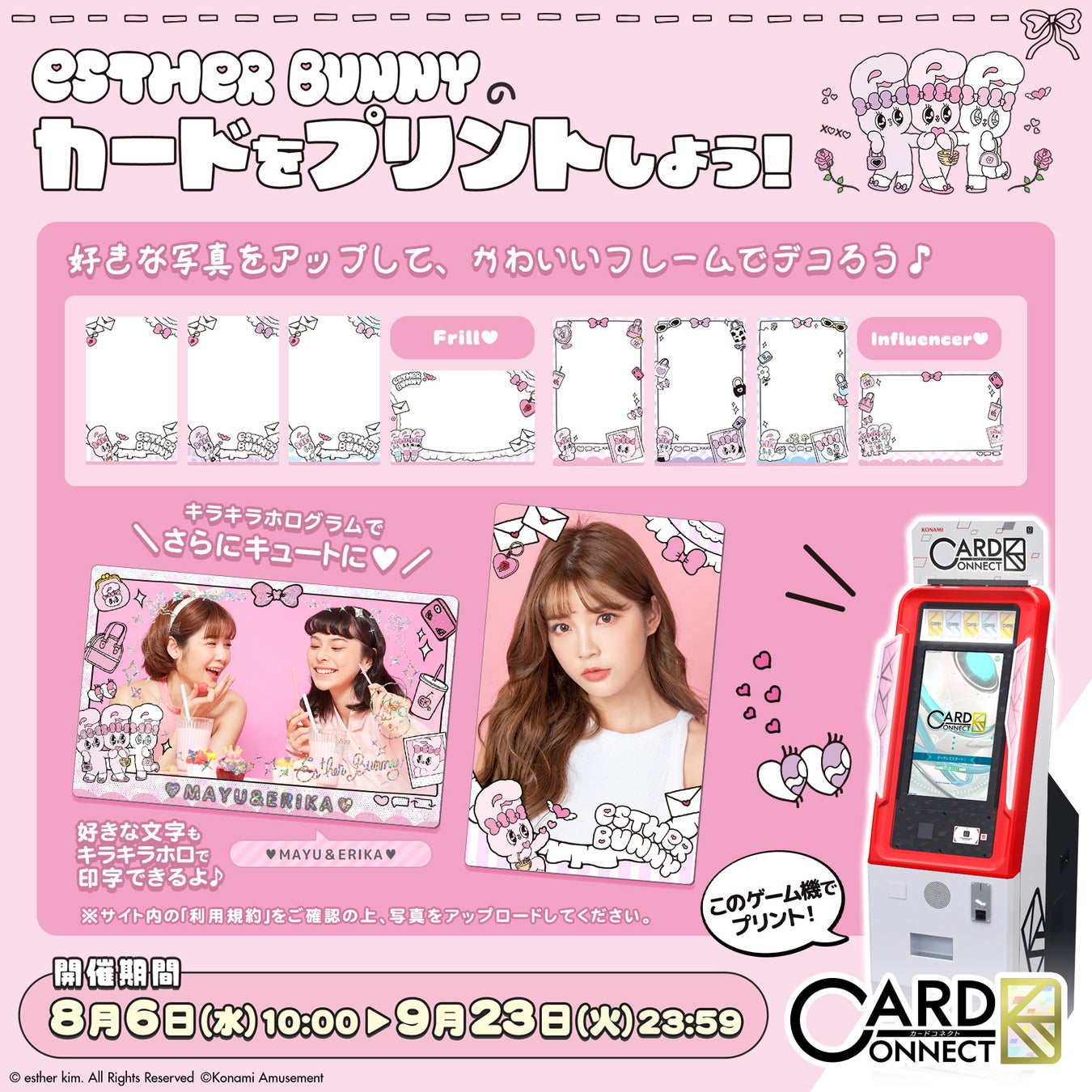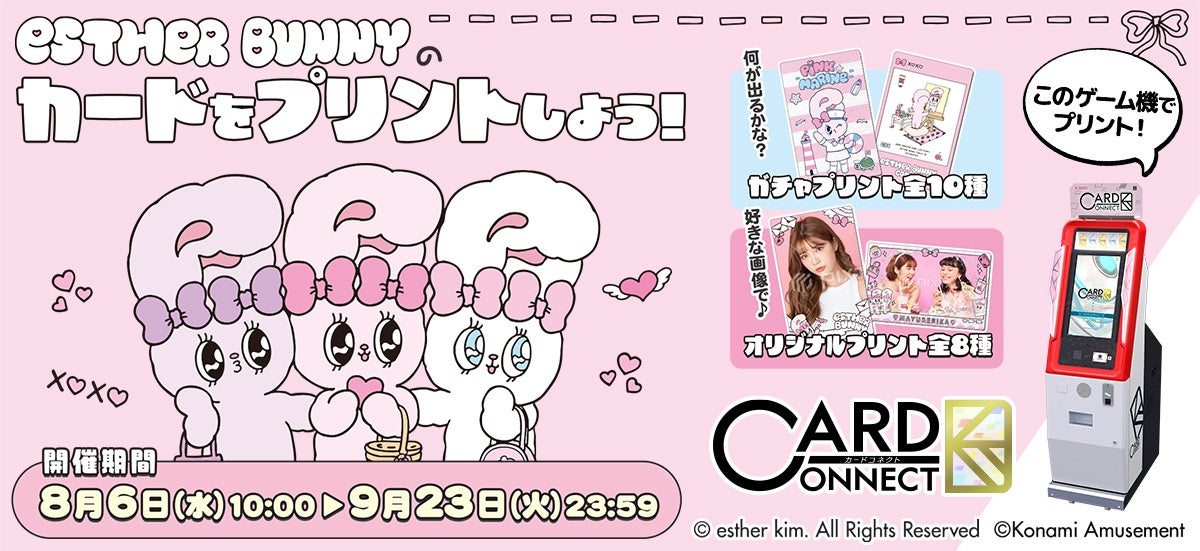株式会社コナミアミューズメントは、アミューズメント施設向けカードプリントゲーム機『カードコネクト』にて、イラストレーター「エスター・キム」氏によるキャラクター『エスターバニー』とのコラボデザインイベントを8月6日(水)から9月23日(火・祝)まで開催することをお知らせします。