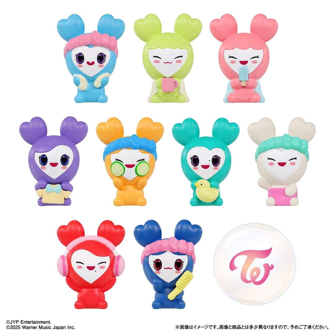 入浴剤が溶けると、TWICEのメンバー9人をモチーフにした愛らしい「TWICE LOVELYS」の指先サイズのマスコット(全9種類)のいずれかが出てきます。ヘアバンドをつけてヘチマパックをする姿、お風呂上がりのアイスを楽しんでいる姿など、まるで「TWICE LOVELYS」のナイトルーティンをのぞいているかのよう。仕草も表情もさまざまな「TWICE LOVELYS」のマスコットを楽しめます。