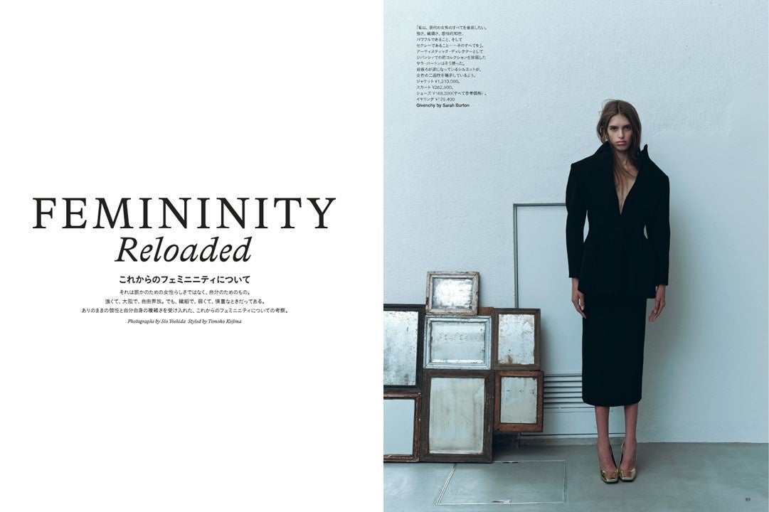 また、現代女性がまとう衣服に宿るオーセンティシティ(真正性)とは何か。ジバンシィのクリエイティブ・ディレクター、サラ・バートンが示す、今日求められるデザイナーの資質と、装う側のアティテュードについても考察。さらに、ポップカルチャーを席巻するハイパー・フェミニン現象や、「グラニー風」「ボディコンシャス」など最旬キーワードを軸に“フェミニニティ”をモードに攻略するスタイルも紹介。全24ページのボリュームで、多角的に“フェミニニティ”を掘り下げていきます。