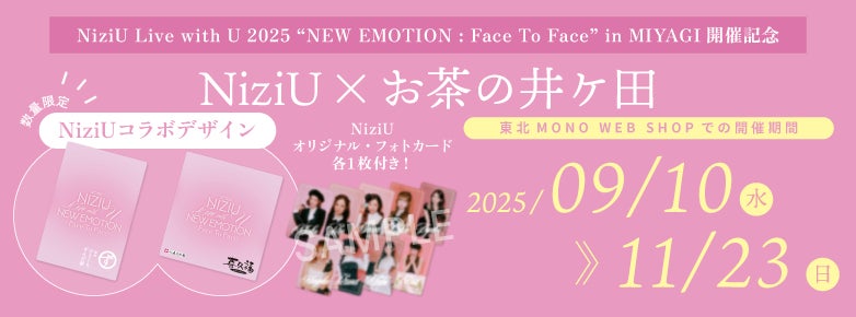 JR東日本東北総合サービス株式会社は、9月13日(土)、14日(日)に開催される日本の9人組ガールズグループ・NiziUによる初のホールツアー「NiziU Live with U 2025 ❝NEW EMOTION : Face To Face❞」仙台公演に合わせて、東日本旅客鉄道株式会社東北本部と宮城の老舗企業、井ヶ田製茶株式会社とのコラボ商品を、9月10日(水)12:00よりJRE MALLショッピング内の「東北MONO WEB SHOP」で先行販売します。
