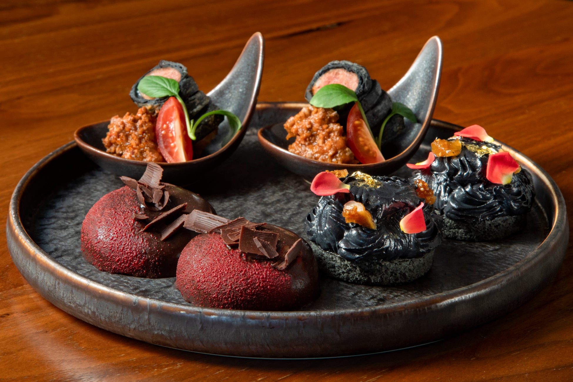スイーツは、黒ゴマの香ばしさと無花果の濃厚な甘みを重ね、漆黒のクリームに赤い花びらを添えた「黒ゴマと無花果のモンブラン」、鮮やかな赤のシュー生地にフレッシュな苺をあしらった「ストロベリーレッドエクレア」など、見た目のインパクトとともに秋にふさわしい深みのあるラインアップをお楽しみいただけます。