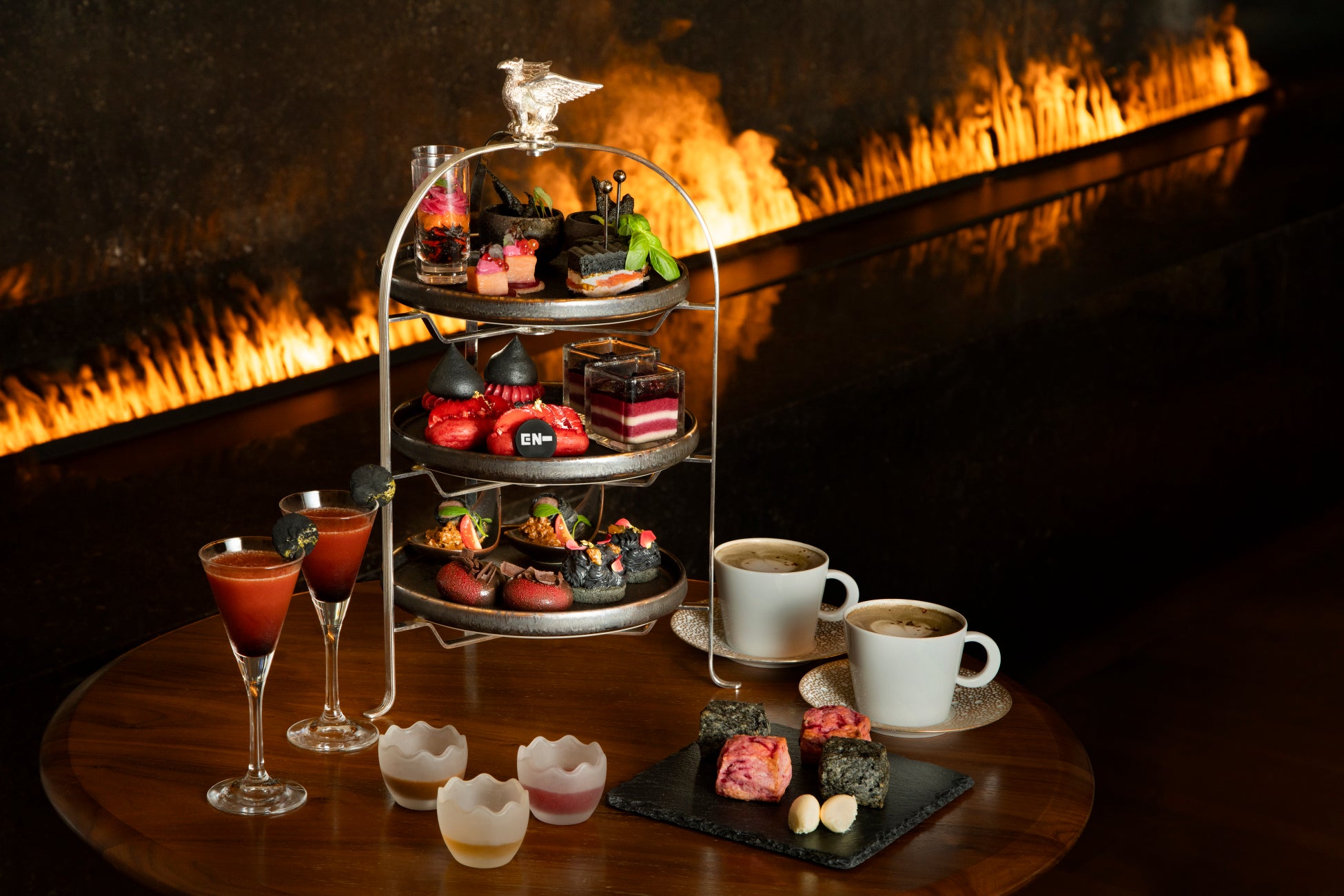 「EN-CHANTED BITE」は、ENHYPENの象徴的な“ヴァンパイア”コンセプトをモダンにアレンジした、スイーツ5品とセイヴォリー5品からなる特別なアフタヌーンティーです。漆黒と深紅を基調にしたゴシックでクラシカルな世界観が、印象的で洗練されたティータイムを演出します。