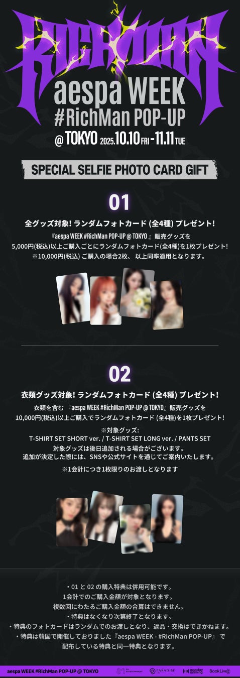 衣類を含む『aespa WEEK #RichMan POP-UP @TOKYO』販売グッズを10,000円(税込) 以上ご購入でランダムフォトカード(全4種)を1枚プレゼントいたします。