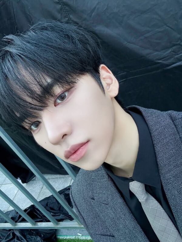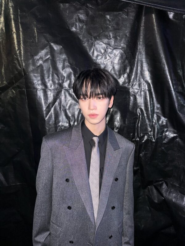 写真には、光沢のあるグレーのスーツを着たハンジュンの姿が盛り込まれている。