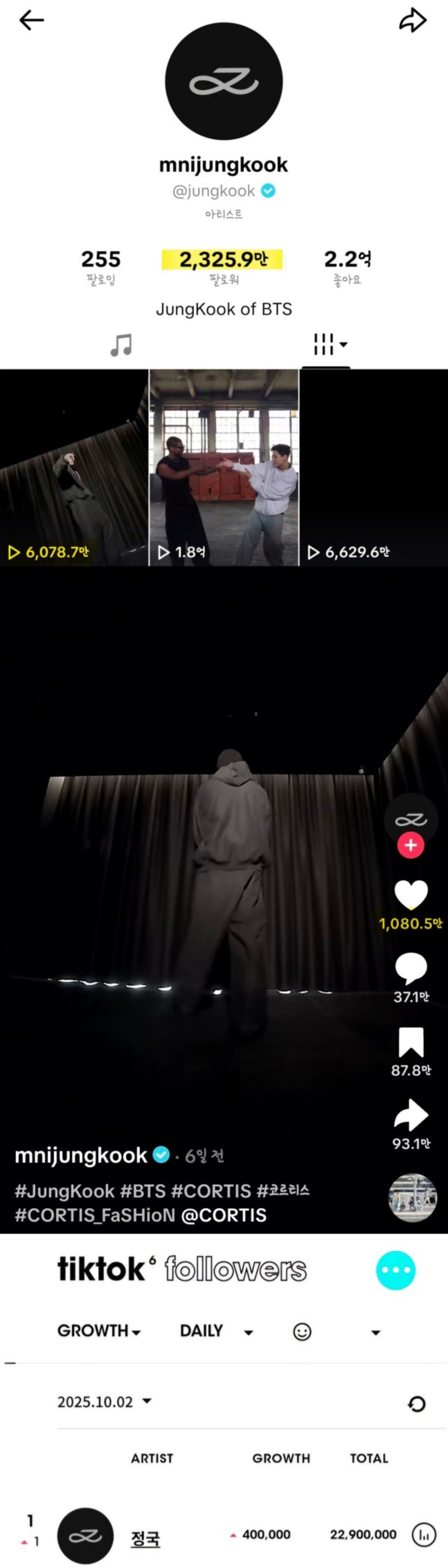 JUNG KOOKの個人TikTokアカウントは、10月2日現在、フォロワー2300万人を突破し、1日で実に40万人増加する爆発的な上昇傾向を示しました。