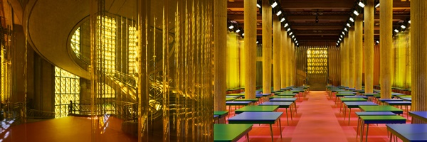 今回のショーの舞台演出はパレ・ディエナの柱が並ぶ空間を日常の家庭空間に抽象化し、異なる色合いのフォルミカテーブルがリズミカルに配置され空間を構成した。