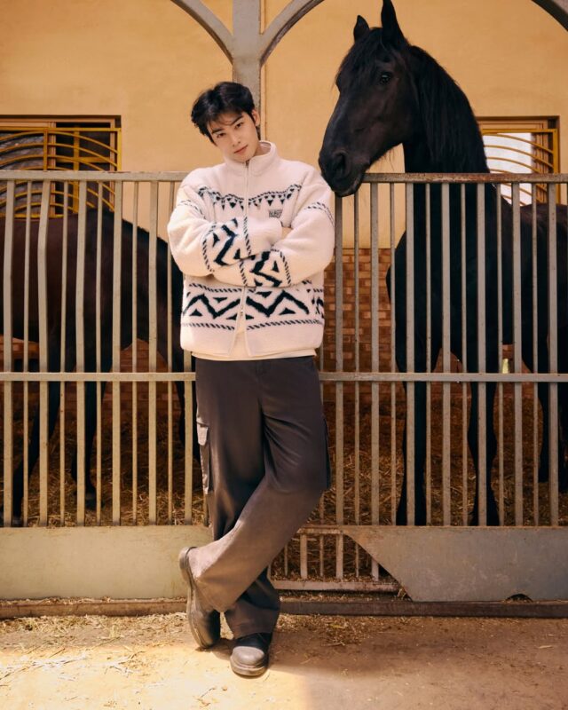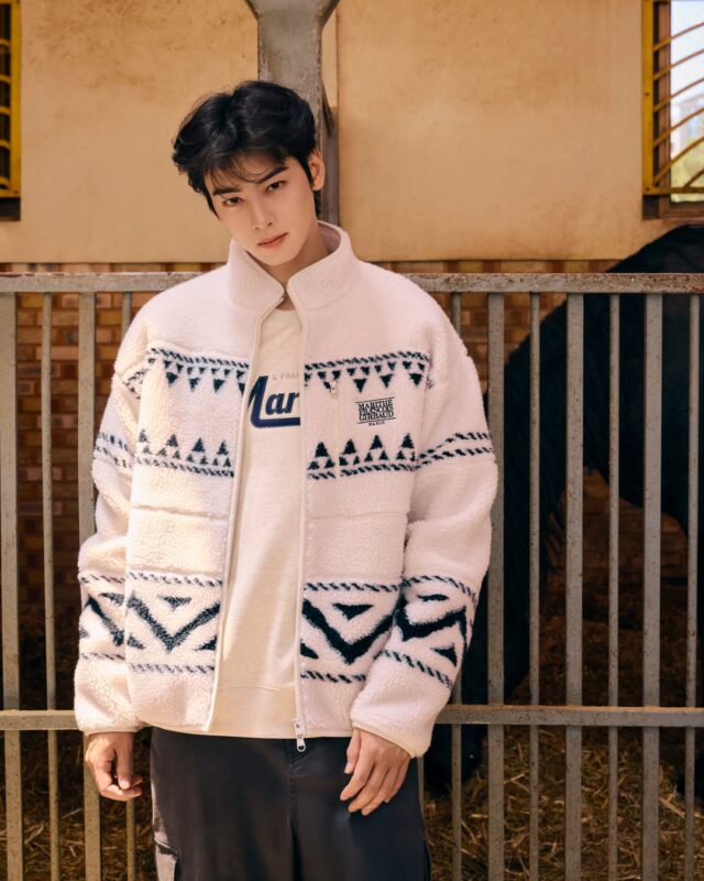 写真には、ホワイトのフリースジャケットを着たチャウヌの姿が盛り込まれている。