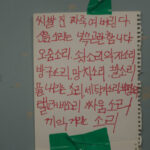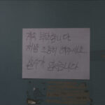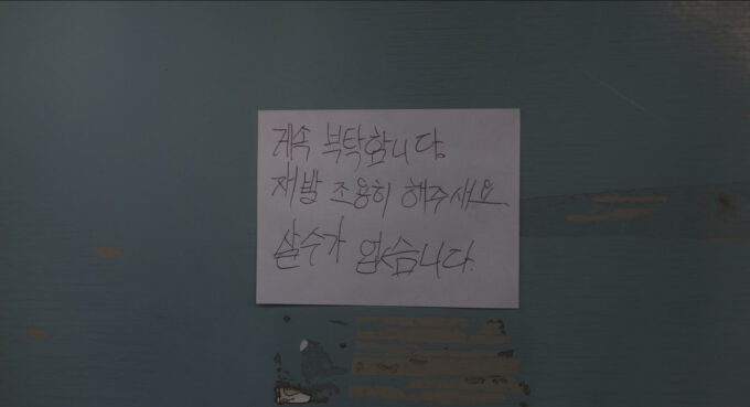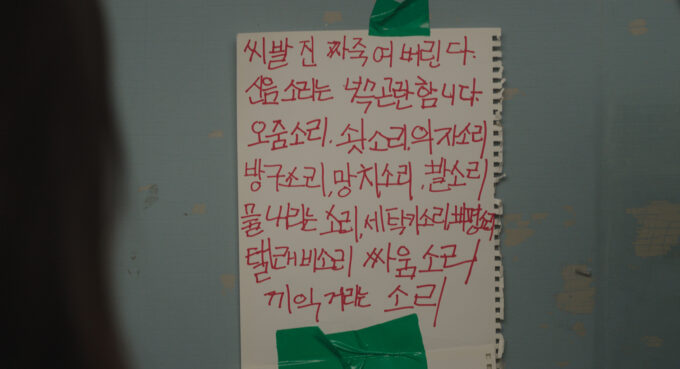 まず目を引くのは、主人公ソ・ジュヨンが住む604号室の玄関扉に貼られた張り紙だろう。黒いマジックで大きく書かれている内容は、「頼むから静かにしてください」という趣旨となっており、少し不穏な匂いが漂う。ただ別カットでは、赤いマジックで殴り書きされた張り紙が残されており、「ぶっ殺すぞ うめき声 椅子の音 足音」といった物騒なメッセージが多数羅列されていている。明らかに険悪なムードが漂って、異様さを感じ取れるはず。近隣住民にも悪影響を及ぼすほどの怖音が、団地に轟いている事を示す証拠ともアイテムとも言える。