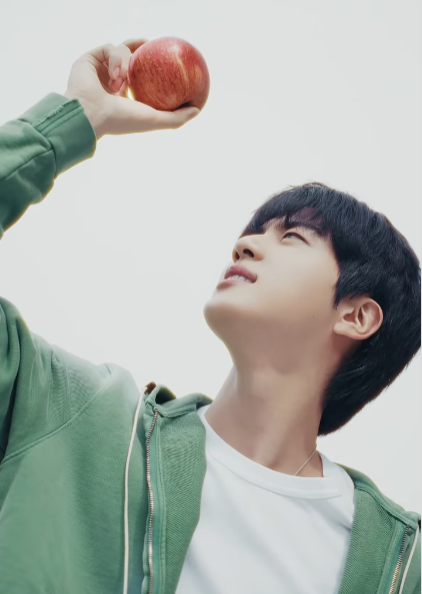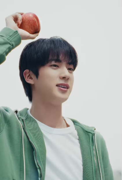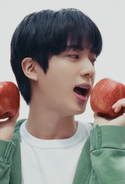 JINはリンゴ やIGINを持ってキュートな姿でカメラに向かってポーズを取っている。