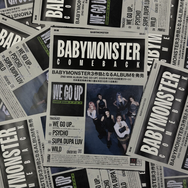 2024年4月のデビューからK-POPガールズグループとして様々な偉業を成し遂げてきたBABYMONSTERが、10月11日(土) 2nd MINI ALBUM [WE GO UP](日本限定特典付輸入盤)をリリースした。リリース日には渋谷・難波ではこのリリースを知らせる号外が配布され、話題を呼んでいる。