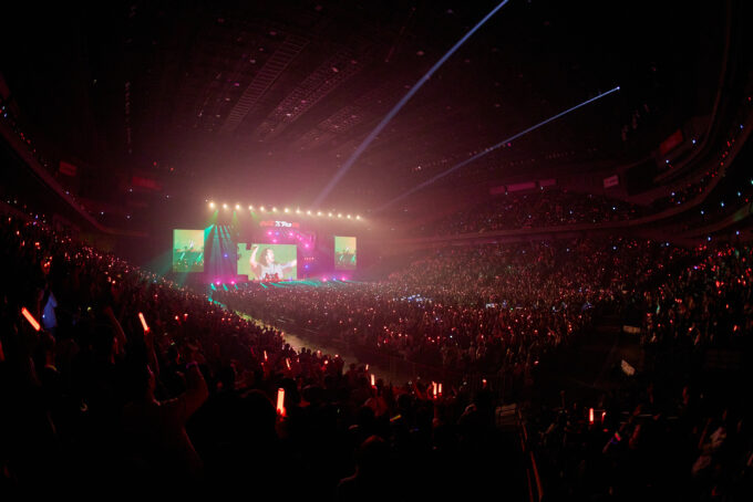 イントロが鳴り響き、Kさんが「Make some noise~!」と会場を煽り、炎の特効演出とともに客席は熱を帯びました。「FIREWORK」、自身初のミリオン認定を達成した3rd SINGLEのタイトル曲「Go in Blind (月狼)」、「Run Wild」のオリジナルメドレーから始まり、1曲目から会場の盛り上がりは最高潮に。NICHOLASさんのラップが印象的な「Scent of you」、スタンドマイクを活かしたパフォーマンスが魅力的な「オオカミ系男子」など全6曲を披露。MCパートでは「キンキンに冷えた“アレ”が飲みたい」と話しながら、メンバーが「コカ・コーラ」ボトルを持つと、「コチるダンス」が特徴的なオリジナル楽曲「放課後宇宙」をサプライズ披露。