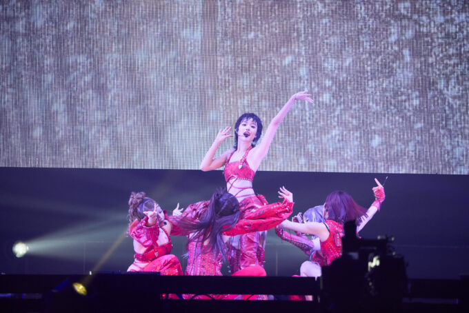 圧巻のライブパフォーマンスに会場から大歓声!MCパートではXGの「コカ・コーラ」エピソードを明かす登場VTRが流れる中、シルエットが会場に映し出されると大歓声が上がり、日本のライブで初披露となった最新曲「GALA」のイントロが流れるとともに「コカ・コーラ」をイメージさせる赤の衣装に身を包んだXGが登場。