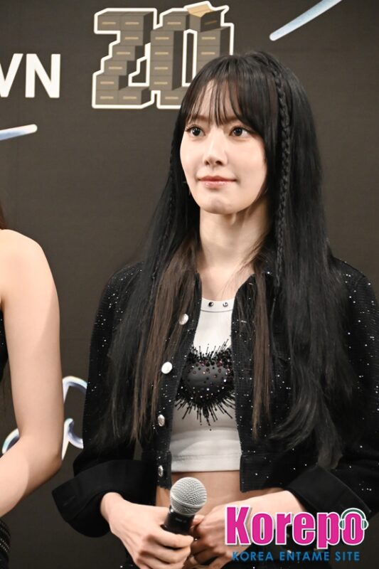 多くの報道陣が詰め掛ける中、ブラックを基調としたクールな衣装で登場したLE SSERAFIM。一人ひとりのあいさつを終えると、質疑応答が始まった。
