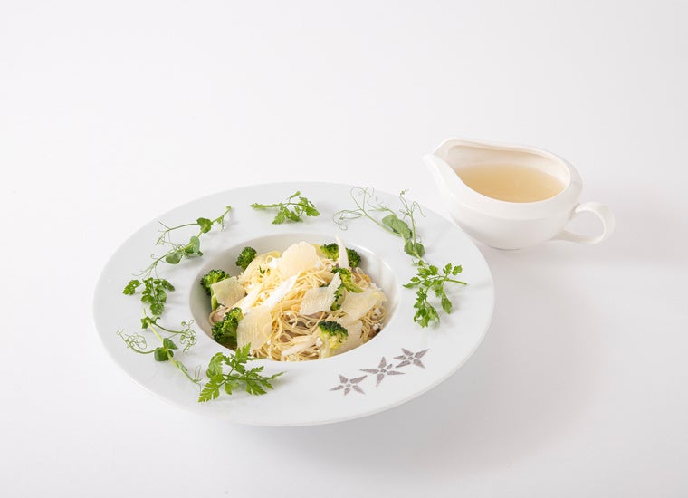 魚介のスープをかけて味わう、2種のチーズを使用したボンゴレビアンコ。