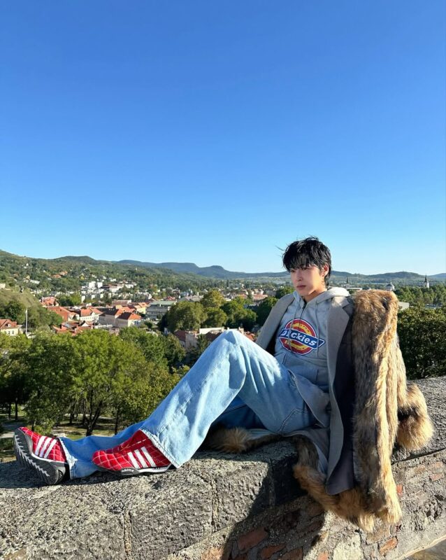 ユンホは真っ青な空の下で石畳にどっかりと腰を下ろした大胆なポーズで視線を集めている。