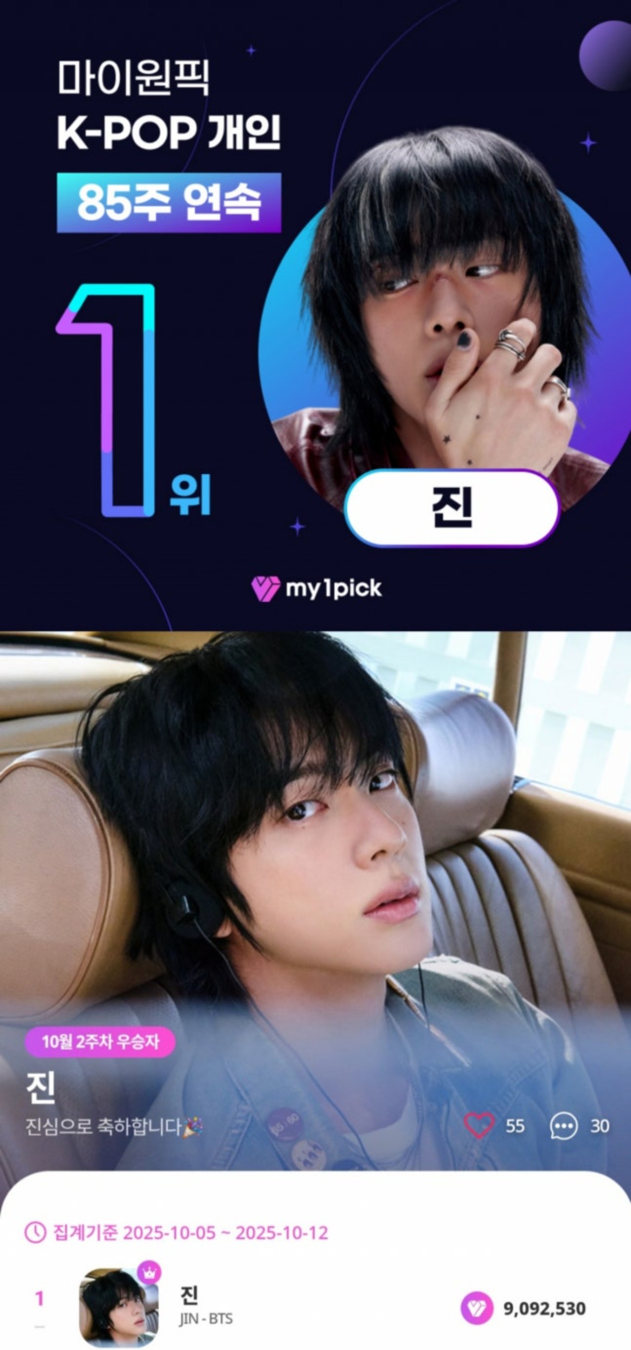 JINは“MY1PICK”の“K-POP個人部門週間ランキング”10月第2週(10月5日~10月12日)の投票で909万2530個のハートを獲得し1位に輝きました。