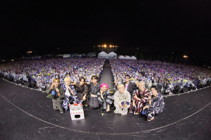 アンコールでは、メンバーがシックな浴衣にチェンジして登場。ファンネームの“JAM”にかけ、白岩瑠姫が活動の節々で大事な曲として紹介してきた楽曲であるアニメ『しまじろう』の定番曲「ハッピー・ジャムジャム」を初めてステージでカバーしました。空にはスマイル模様の花火が打ち上がり、可愛らしく歌い踊るメンバーの姿を見て、会場全体に満面の笑顔が広がっていきます。最後は、豆原の「皆さんでもっと思い切り、ここから良い旅をしていきたいと思います。みんなと一緒に、もっと上行くぞ!」というひと言でメンバー全員が作詞に参加したファンソング「Bon Voyage」でフィナーレ。感謝と未来への希望を込めたこの楽曲に合わせ夜空は大輪の花で埋め尽くされ、華やかにライブを締めくくりました。