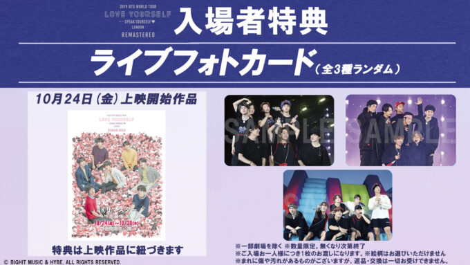 BTSの過去のライブを10月3日(金)より4作品連続で全国劇場公開中の「BTS MOVIE WEEKS」。その第3弾となる「2019 BTS WORLD TOUR ‘LOVE YOURSELF: SPEAK YOURSELF’ LONDON」入場者特典が解禁となりました。10月24日(金)の上映開始日から配布される本入場者特典は「ライブフォトカード(全3種ランダム)」。「2019 BTS WORLD TOUR ‘LOVE YOURSELF: SPEAK YOURSELF’ LONDON」ライブ中の集合写真を使用した、思い出深いフォトカードとなっております。本入場者特典の配布期間は10月24日(金)から、「2019 BTS WORLD TOUR ‘LOVE YOURSELF: SPEAK YOURSELF’ LONDON」の上映期間中に配布となります。無くなり次第終了となりますので、ぜひ劇場で手に入れてください。また、「オリジナルステッカーシート」特典が手に入るムビチケカードや、オリジナルスマホ壁紙がついてくるムビチケオンライン券は各作品上映開始日の前日まで販売中!詳しくは公式HPをご確認ください。