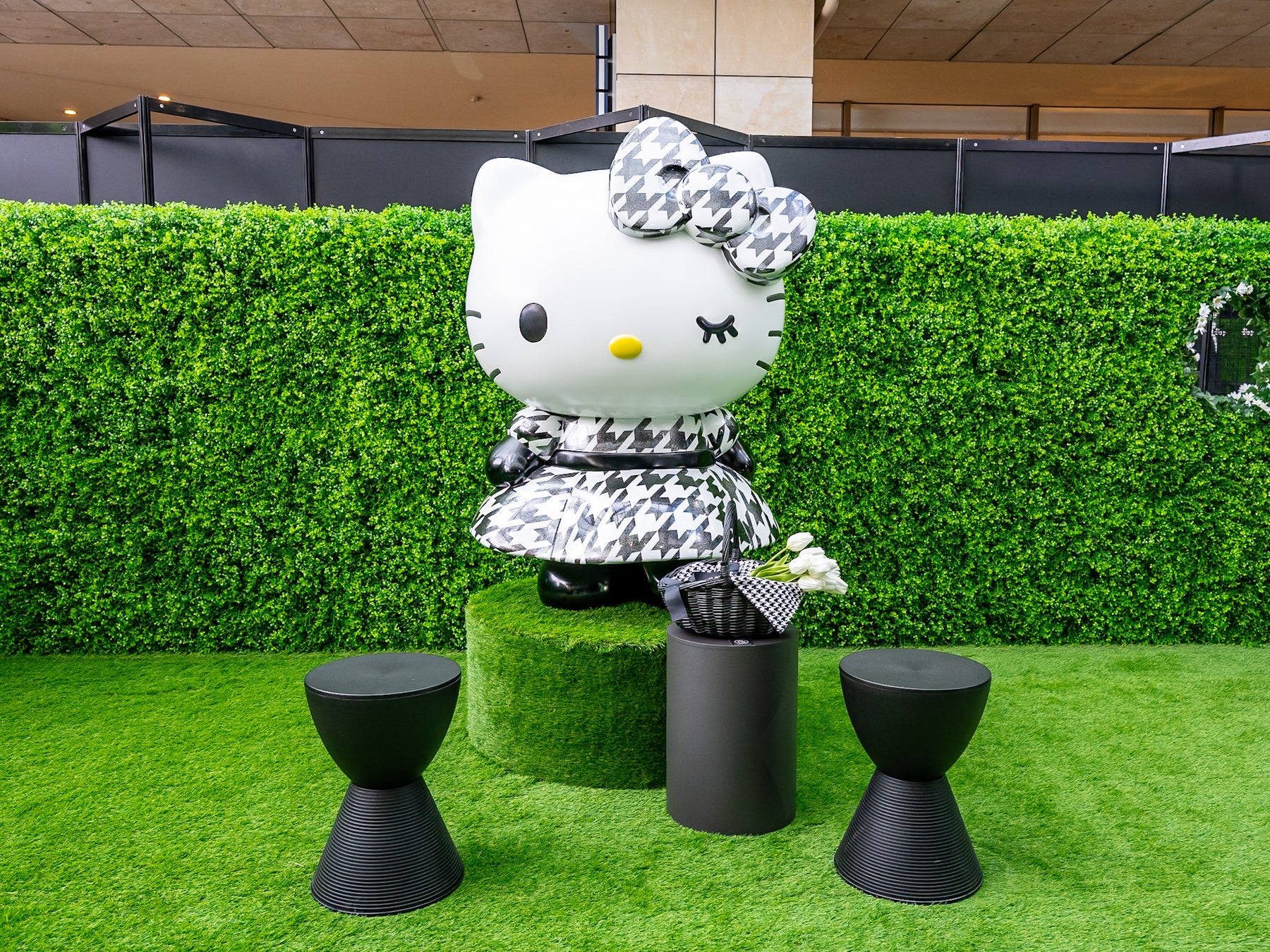 高さ約2メートルのハローキティのフェイス形のゲートを抜けると、ロンドン郊外出身のプロフィールを持つハローキティにちなんだイングリッシュガーデンをイメージした空間と、千鳥格子を基調としたシックなデザインを掛け合わせたフォトジェニックな「ピクニックエリア」が広がります。「りんごの木」や、ハローキティと写真が撮れる「フォトスペース」、そして「フレグランスエリア」では、その日のあなたの気分に合った香りのミニボトルをギフトとして受け取れるなど、心ときめくコンテンツが満載です。