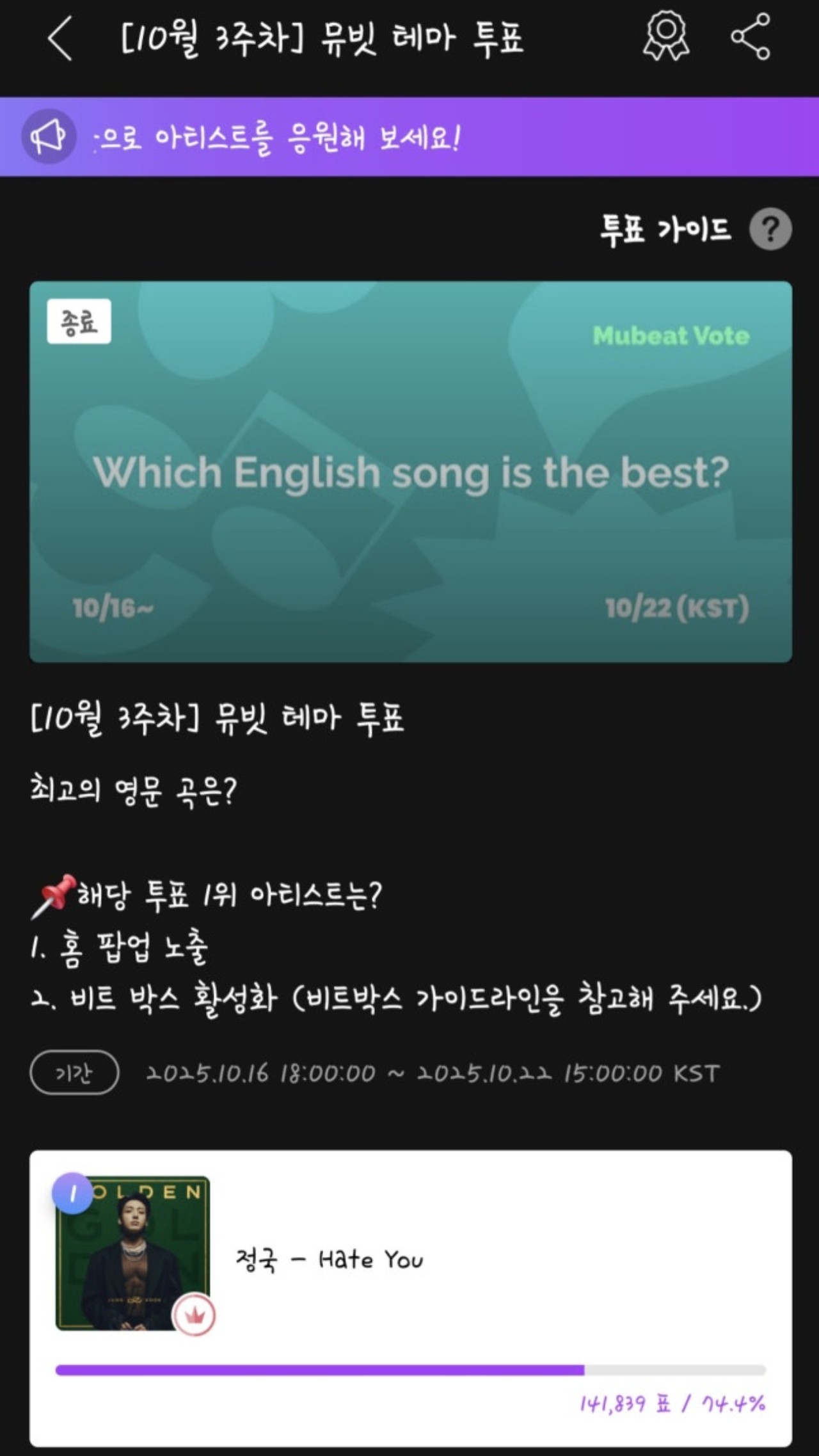 JUNG KOOKが2023年11月に発売した初のソロアルバム「GOLDEN」の収録曲「Hate You」は、10月16日~22日までグローバルK-POPプラットフォーム“Mubeat”で行われた「最高の英語曲は?」というアンケートで1位を獲得しました。 「Hate You」は14万1839票を獲得し、全体の投票数の74.4%に達する圧倒的な得票率を記録しました。