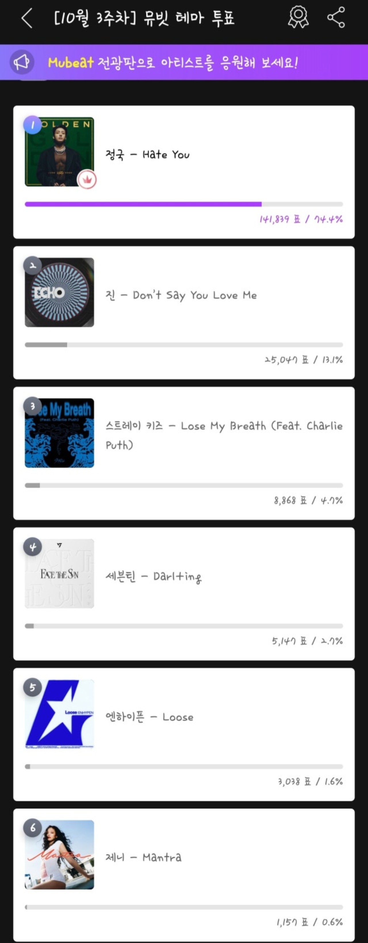 1位の「Hate You」に続き、2位は「BTS」のJINのソロ曲「Don't Say You Love Me」、 3位は「Stray Kids」の「Lose My Breath (Feat. Charlie Puth)」、4位は「SEVENTEEN」の「Darl+ing」、5位は「ENHYPEN」の「Loose」、6位は「BLACKPINK」ジェニーのソロ曲「Mantra」の順となりました。