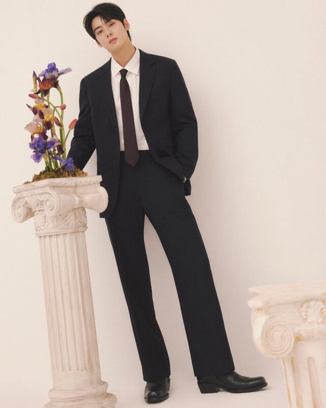 写真には、定番のブラックスーツを着たチャウヌの姿が盛り込まれている。