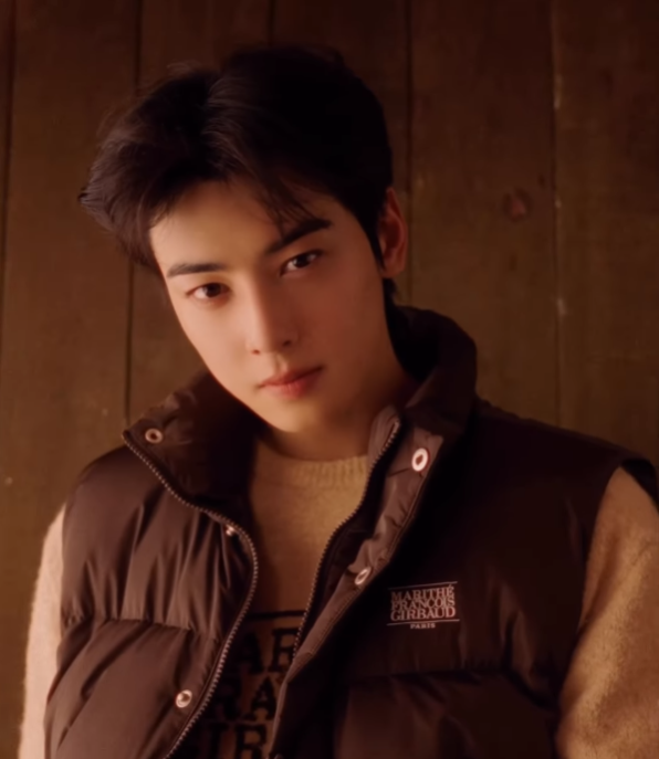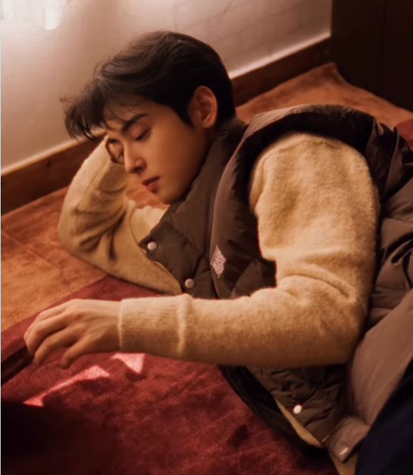 動画には、ニットとダウンベストを着たチャウヌが床に横になってレコード盤をいじっている姿が盛り込まれている。