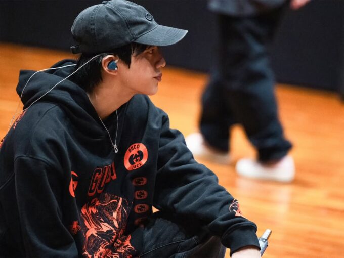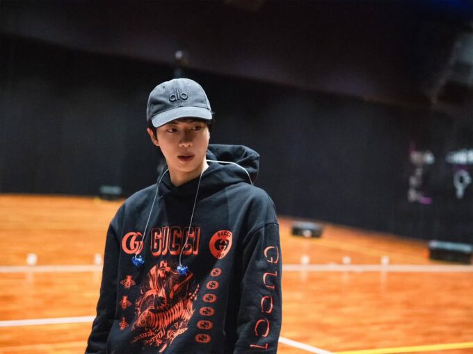 JINはキャップをマッチさせてヒップホップ歌手のようなカリスマあふれる姿を見せて、公演に対する期待をいっそう高めている。