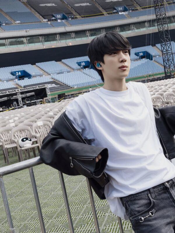また、手すりに寄りかかってどこかを見ているJINの姿も公開された。JINはリラックスした雰囲気で最後のリハーサルをこなしている様子だ。