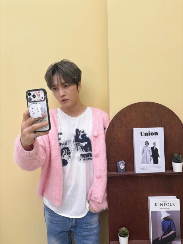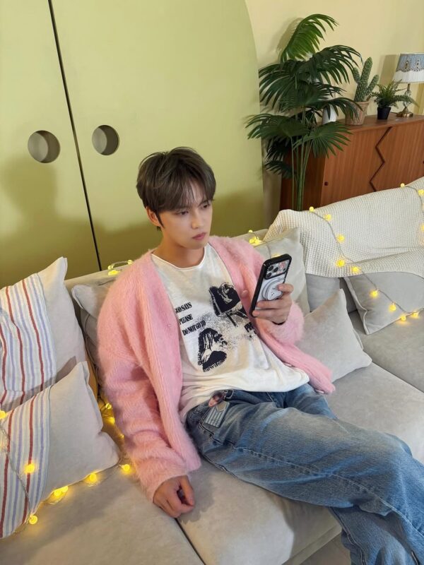 ピンクのカーディガンもぴったりのジェジュンのキュートな魅力が視線を集めている。