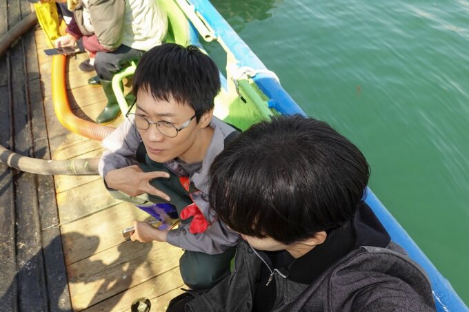 ふたりは海上に浮かぶ船の上でカメラに向かってポーズを取っている。