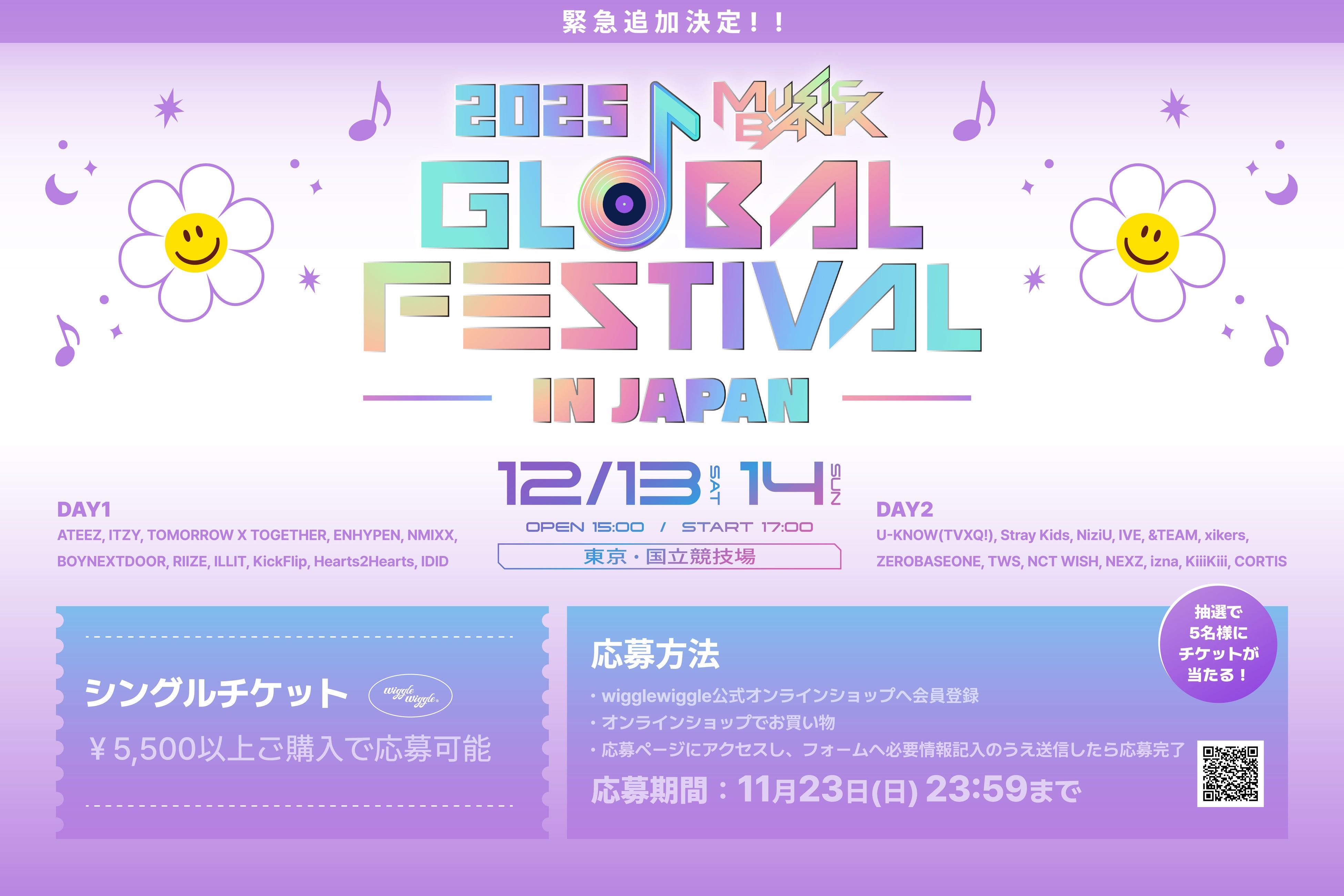 株式会社ビーエムスマイルジャパン(所在地:東京都渋谷区)が展開するライフスタイルブランド「wiggle wiggle(ウィグルウィグル)」は、2025年12月13日(土)、14日(日)に国立競技場で開催される「2025 MUSIC BANK GLOBAL FESTIVAL IN JAPAN」に合わせ、抽選で合計5名様に観覧チケット(シングル)が当たる特別キャンペーン【第2弾】を実施いたします。