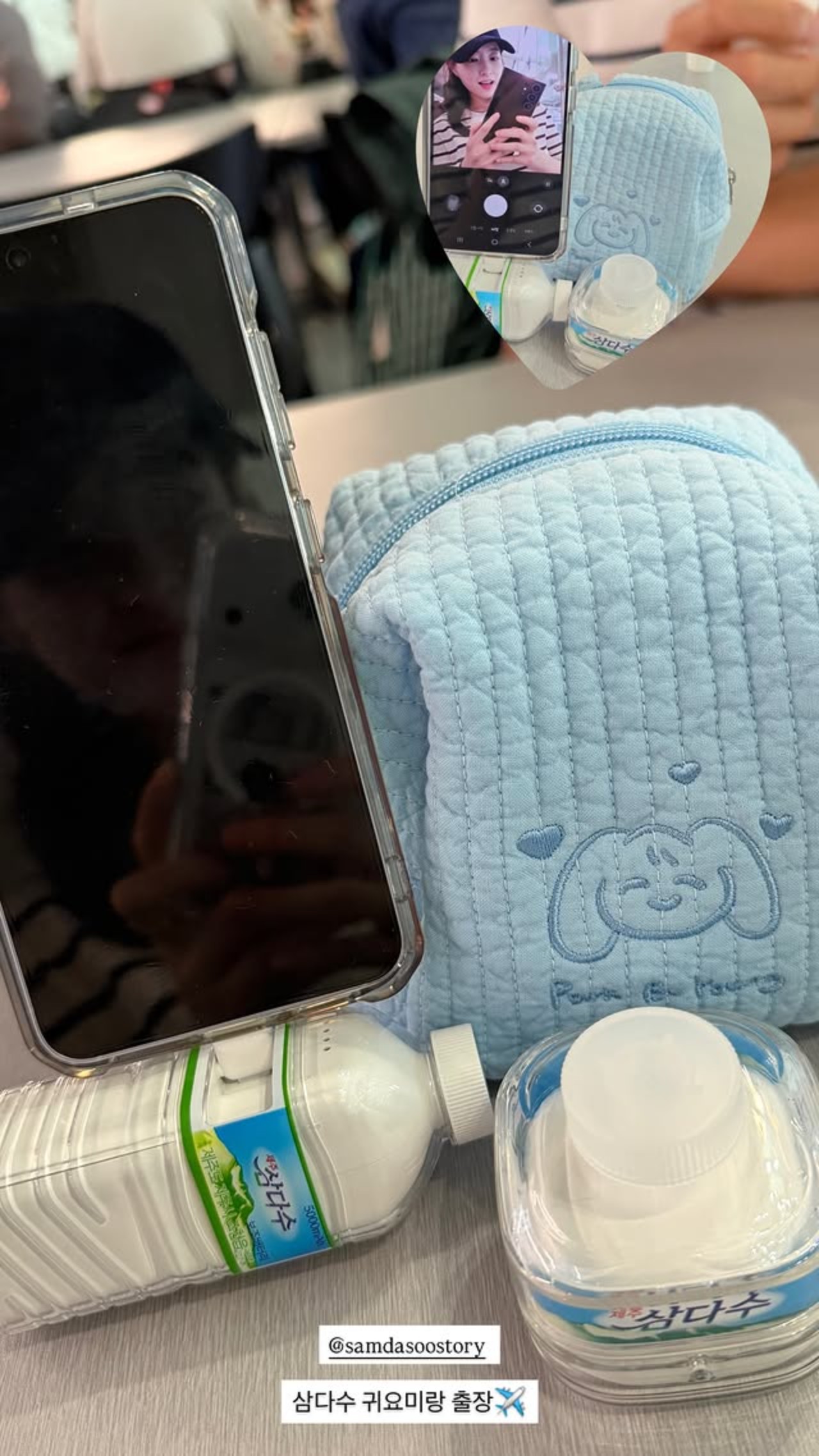 公開された写真には、パク・ボヨンがテーブルの上にポーチやスマホなどを広げている様子が写っています。特に自身がモデルを務めるミネラルウォーターブランド”サンダス”のボトルのように見えるが、中身がミネラルウォーターではなく白くて注目を集めました。 実は、その”サンダス”が制作したモバイルバッテリーとイヤホンケースだったのです。
