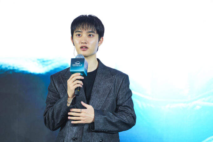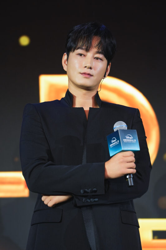 現在、独占配信中の『捏造された都市』から、W 主演を務めているチ・チャンウクとド・ギョンスが、モノトーンのスーツで登場。『メリーベリー ラブ』(仮)のステージ登壇に続いて再度登場したチ・チャンウクは、余裕のある面持ちでド・ギョンスをリードする。チ・チャンウクは、「今作は、 10 年前に出演した映画『操作された都市』と同じ世界観を持つ作品なので、思い入れが強く、責任感を持って挑みました。視聴者の方がテジュンの目線を追いかけられるよう、彼の感情を大事に表現したいと思いました」と意気込みを語った。ド・ギョンスは、「ディズニープラスが NO.1 です!」とウィットにとんだ一言で会場を沸かせると、初の悪役への挑戦に対し、「恐れよりも、新しいキャラクターを演じられるワクワクの方が大きかったです。実際に経験することができないキャラクターなので、イマジネーションを膨らませるのと同時に、台本に忠実に演じることに注力しました。見ている皆さんが、本当にこの人は悪い人なんじゃないか、金輪際見たくないという思いを抱くような演技がしたいと思いました」と語り、「(悪役は)思ったよりも、楽しい経験でした」と振り返った。