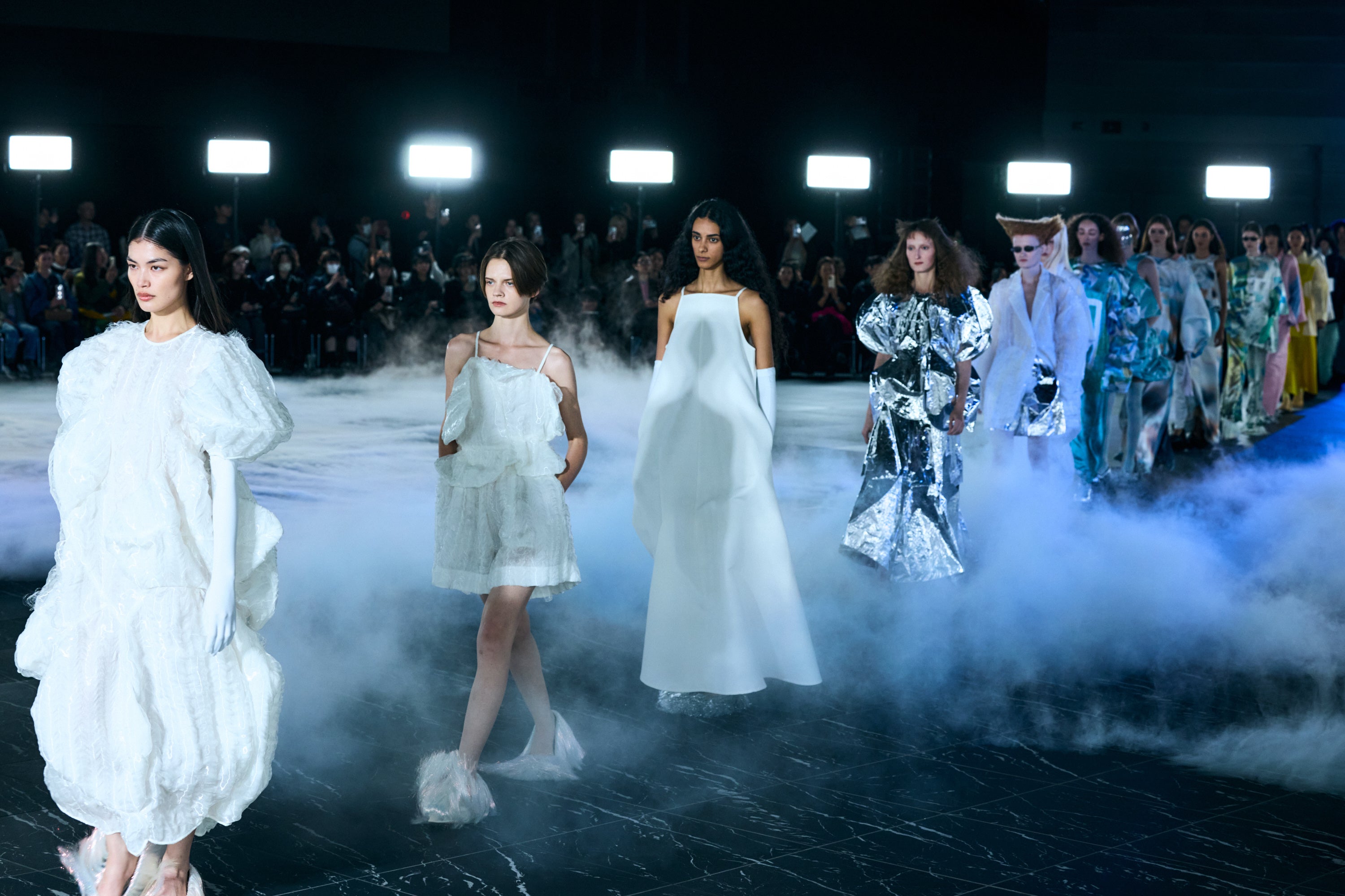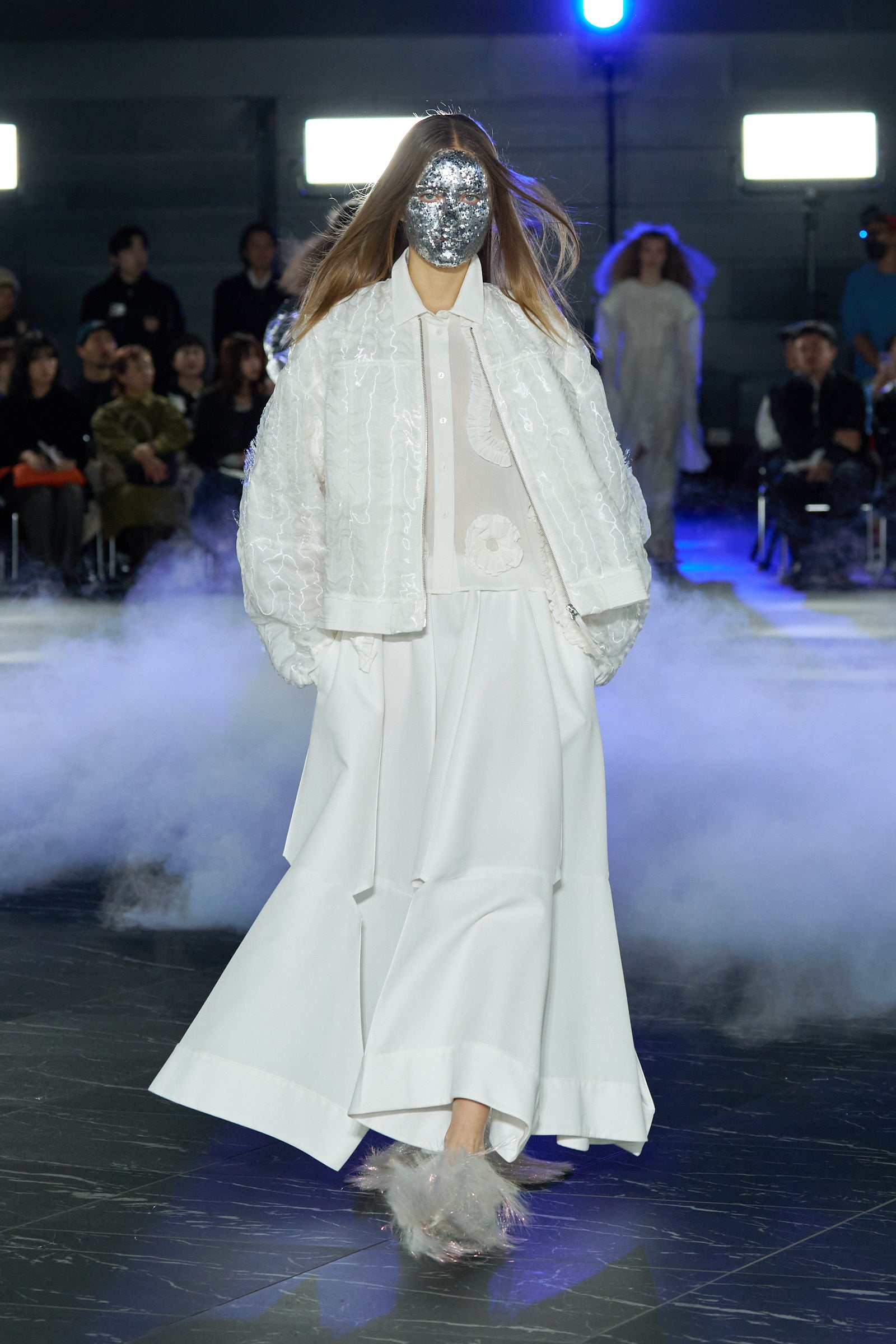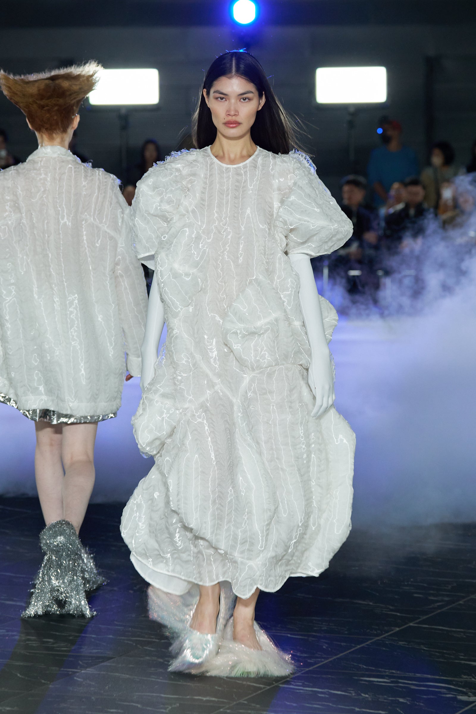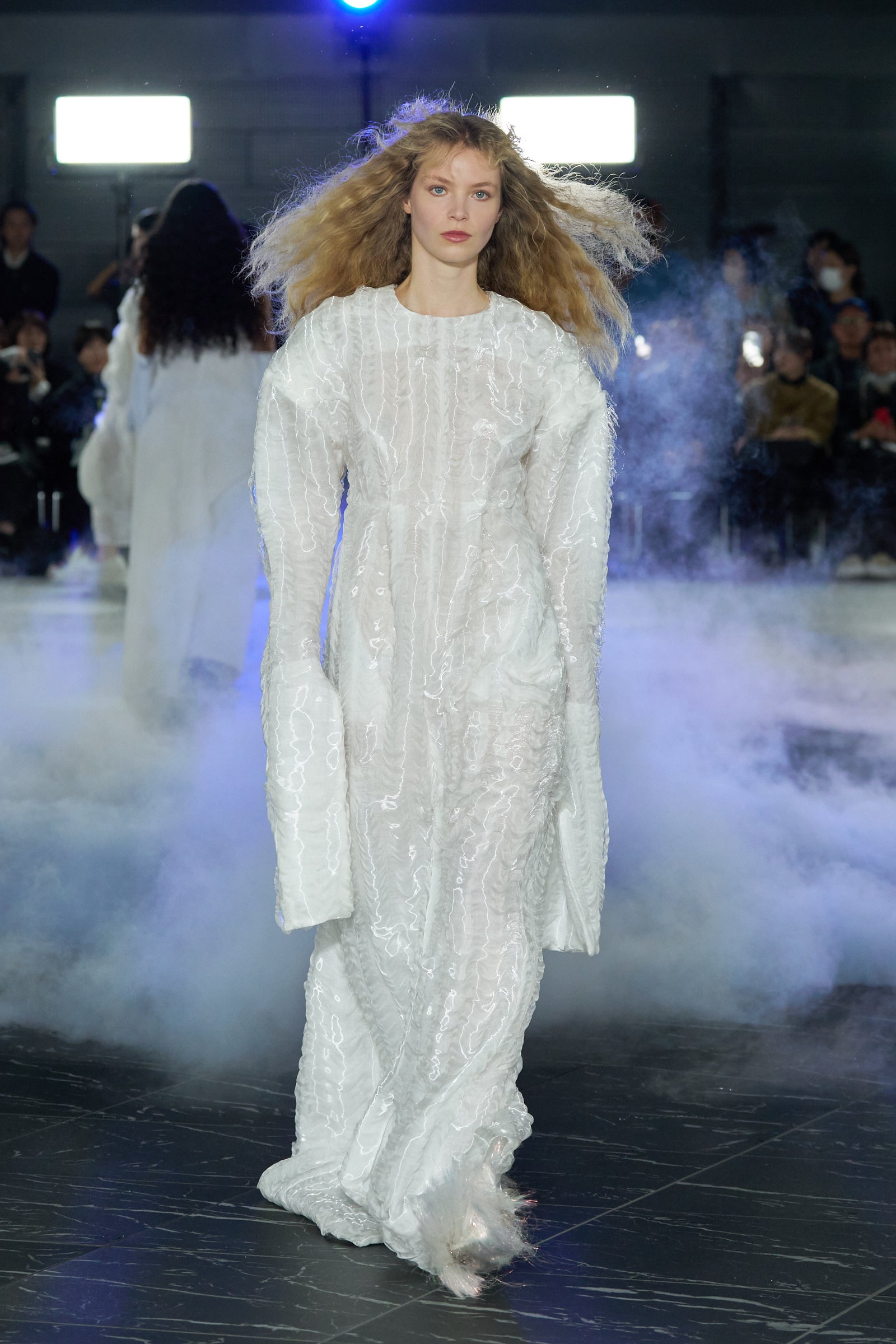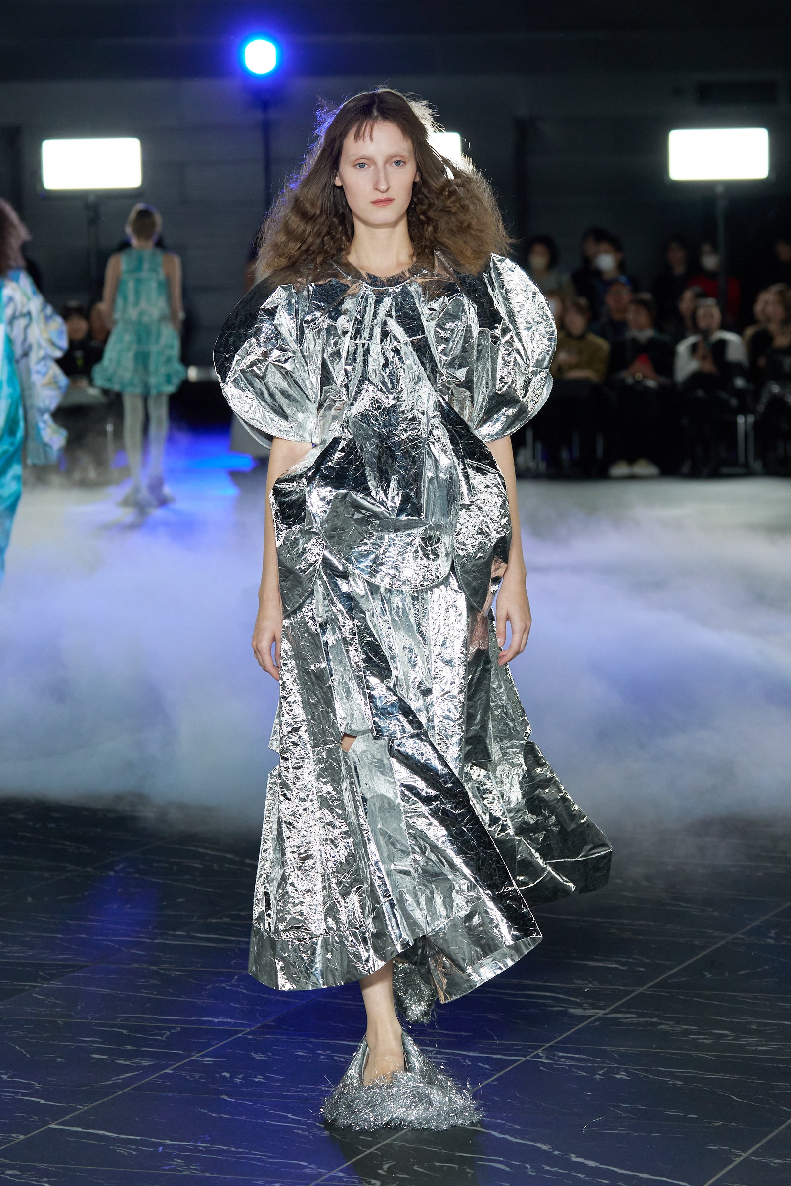 ランウェイでは、モノトーンから始まり、グレーやベージュのワントーン、モンスターを想起させるファーアイテム、惑星をモチーフにセレクトされたプリント、シルバー箔を施したドレスなど、幅広い素材と造形を展開。