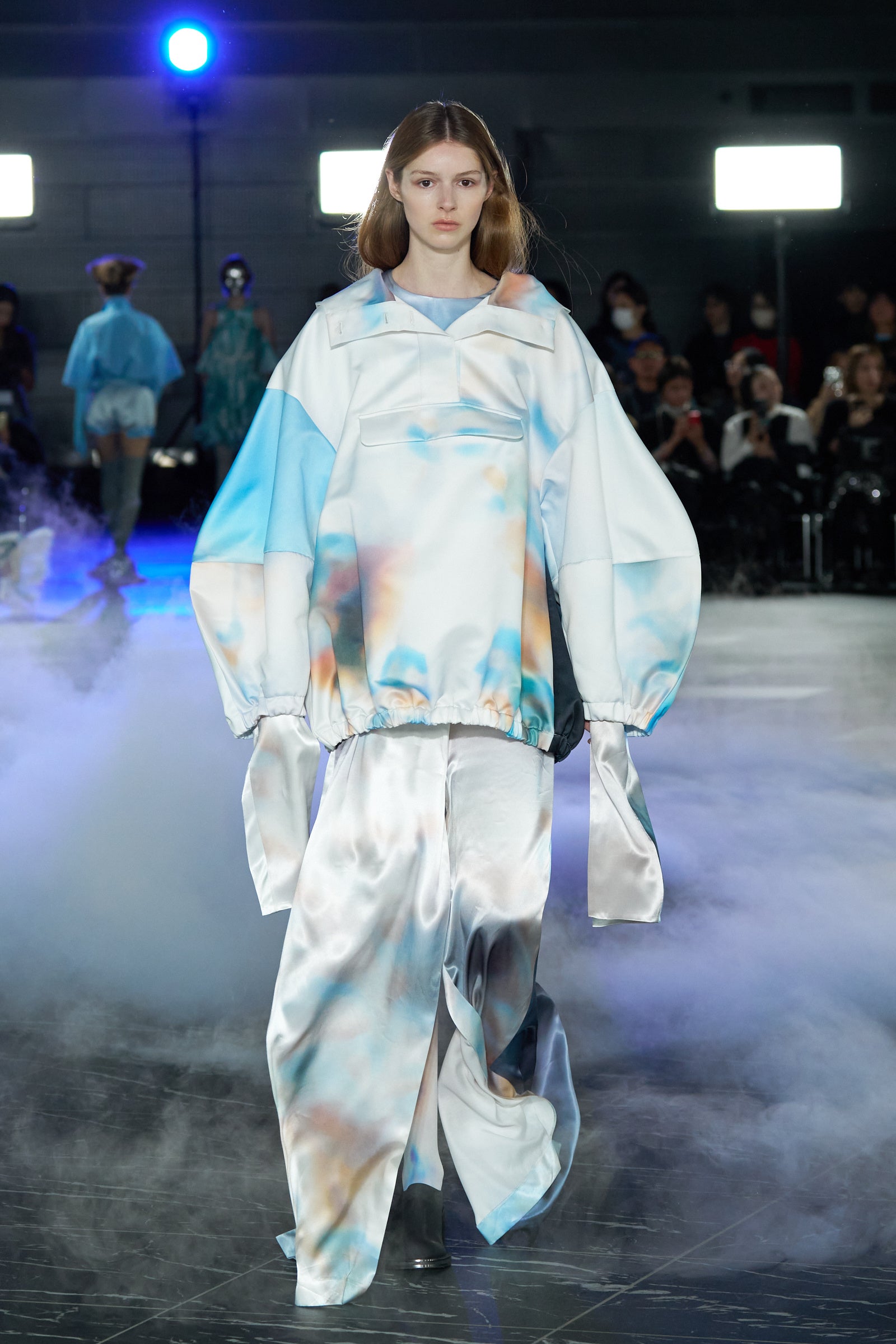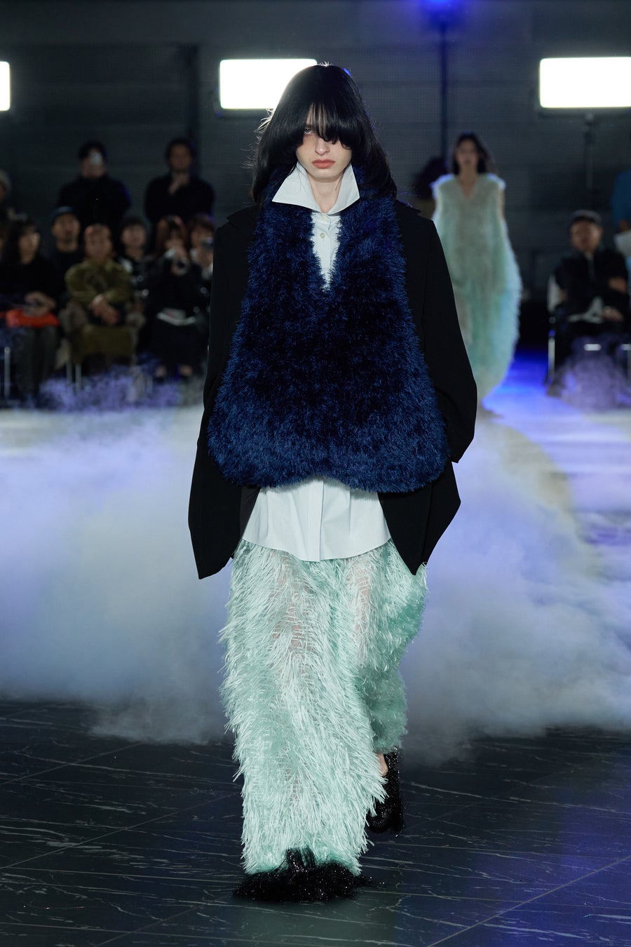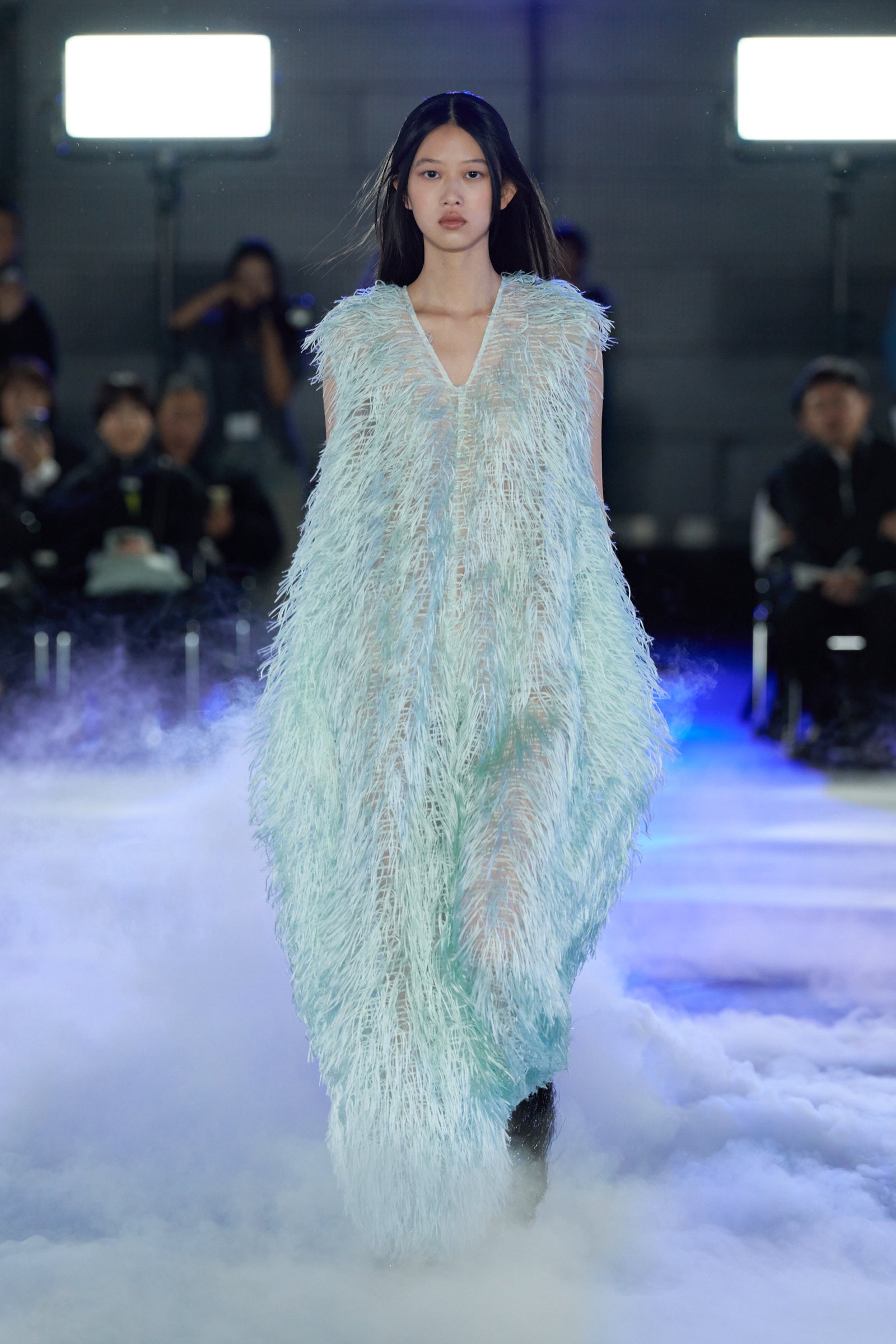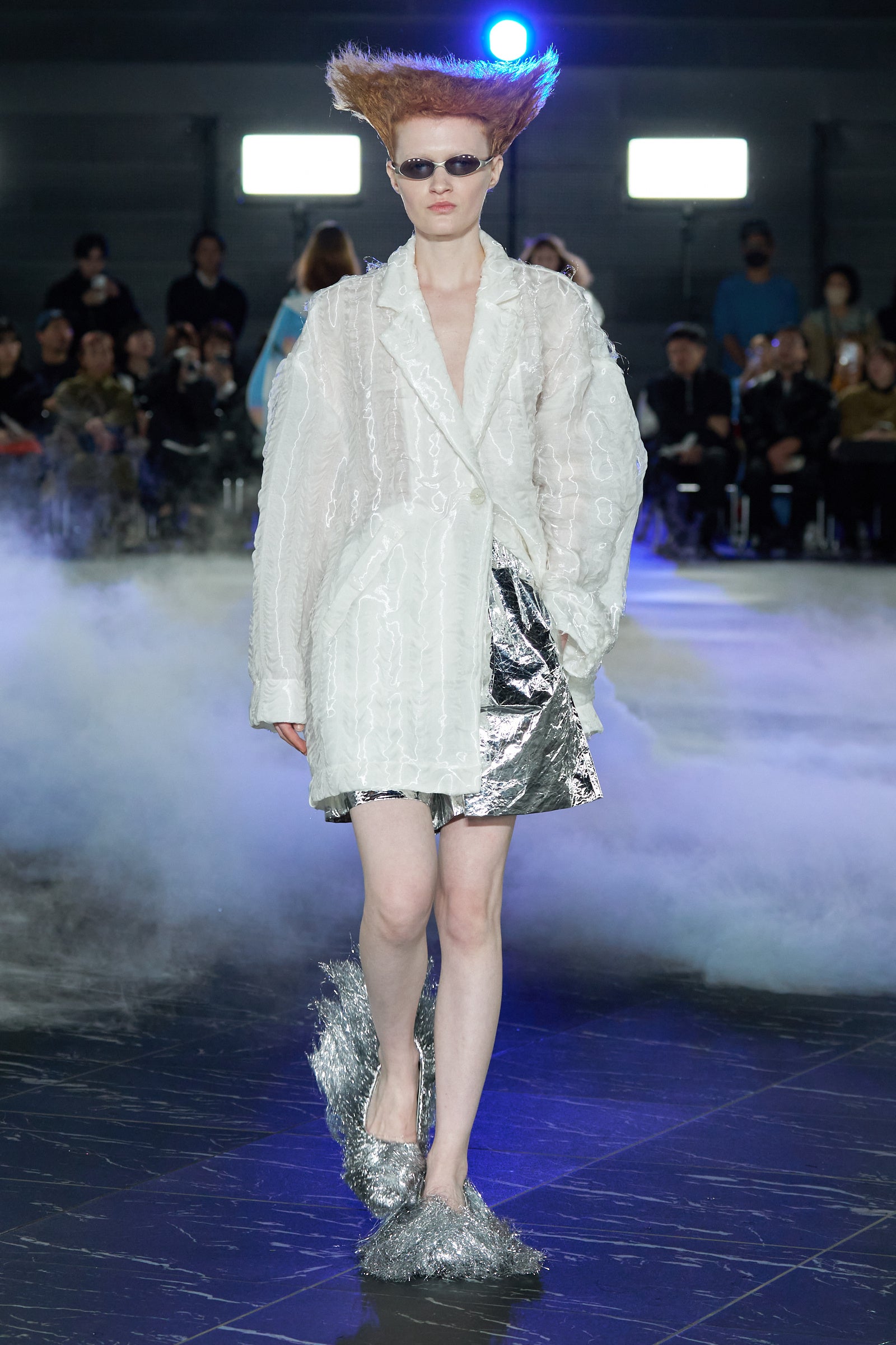 ランウェイでは、モノトーンから始まり、グレーやベージュのワントーン、モンスターを想起させるファーアイテム、惑星をモチーフにセレクトされたプリント、シルバー箔を施したドレスなど、幅広い素材と造形を展開。