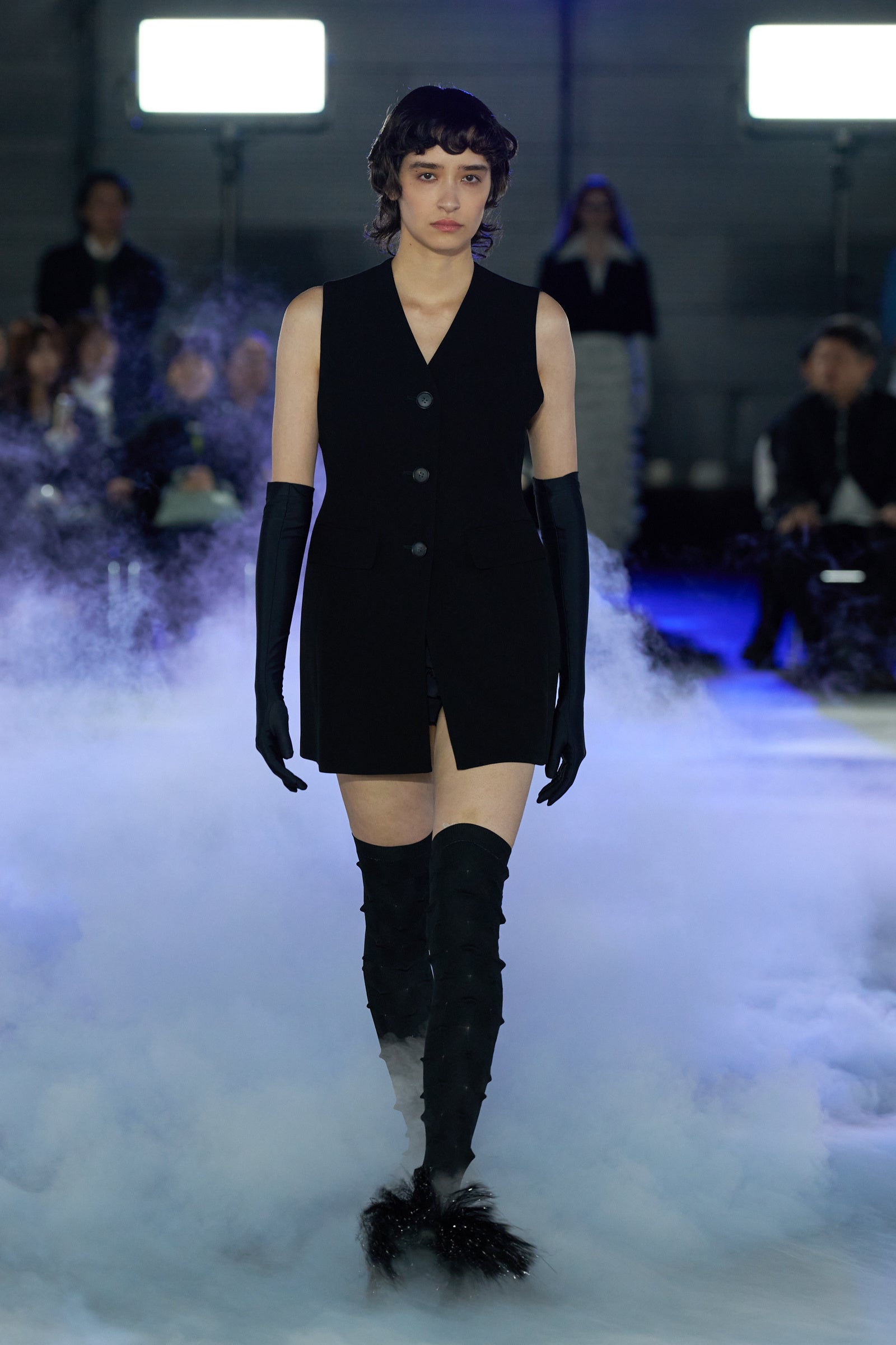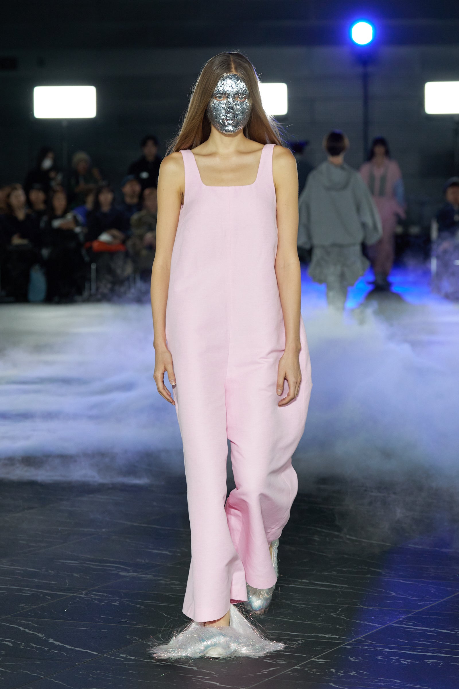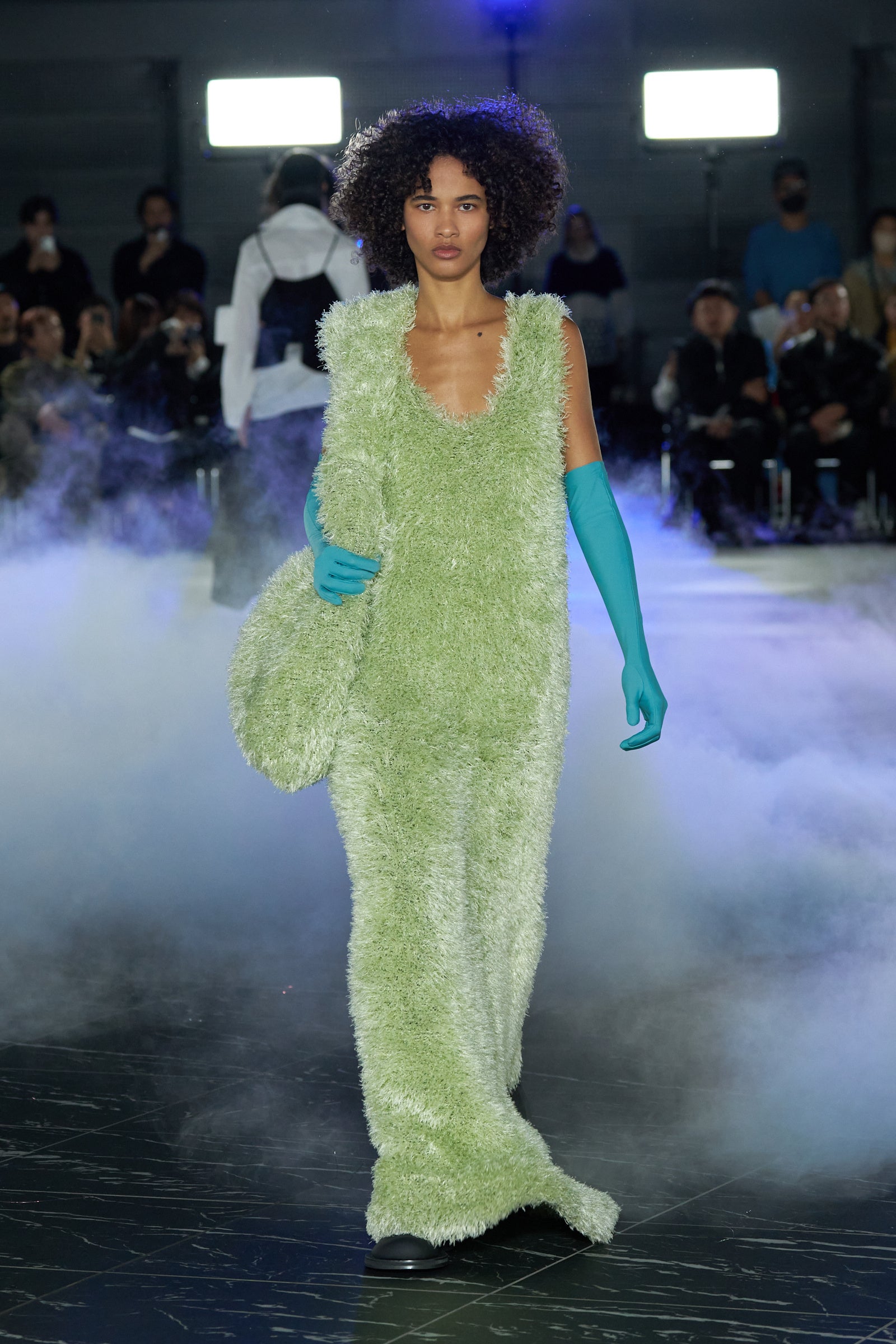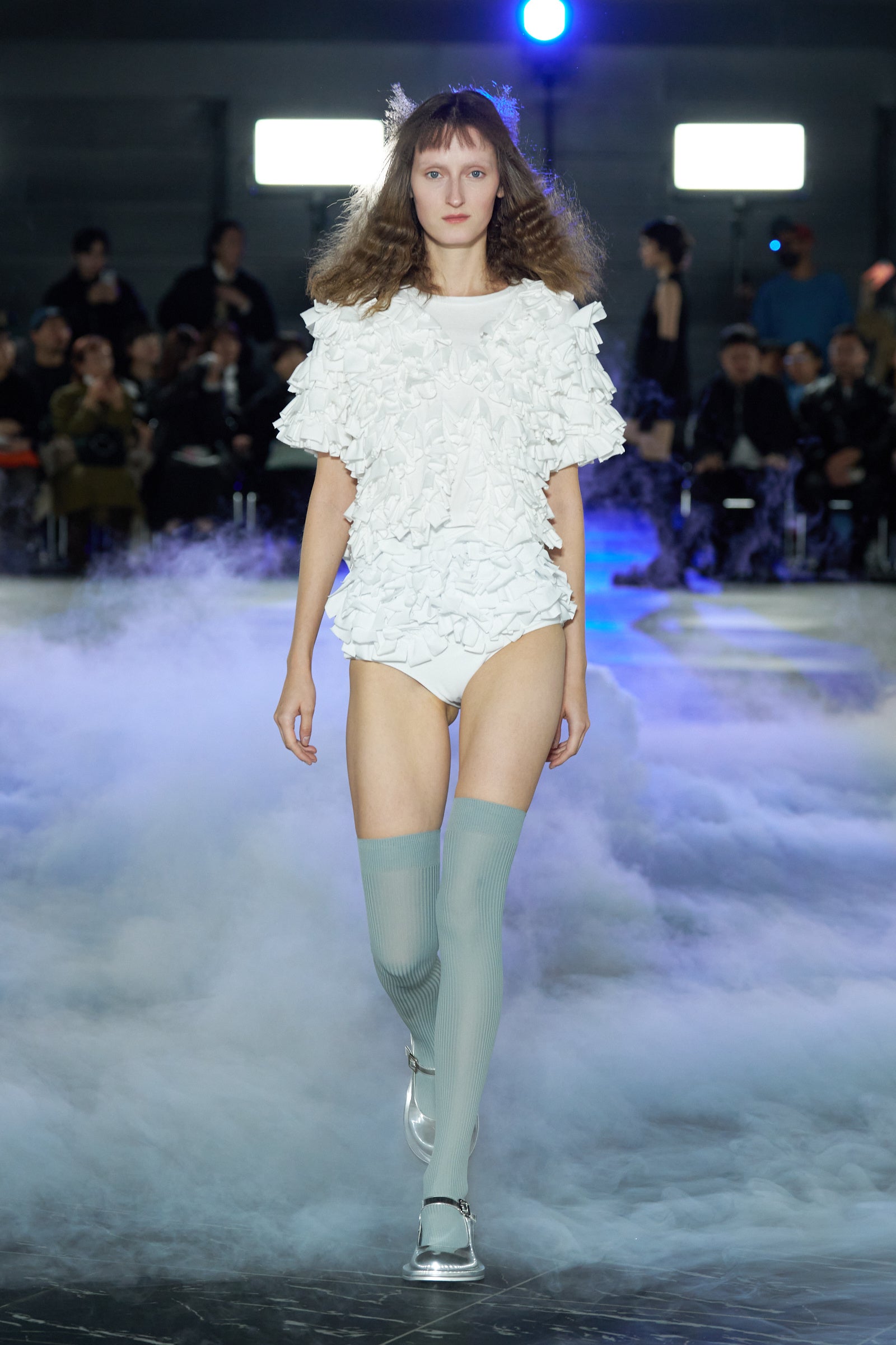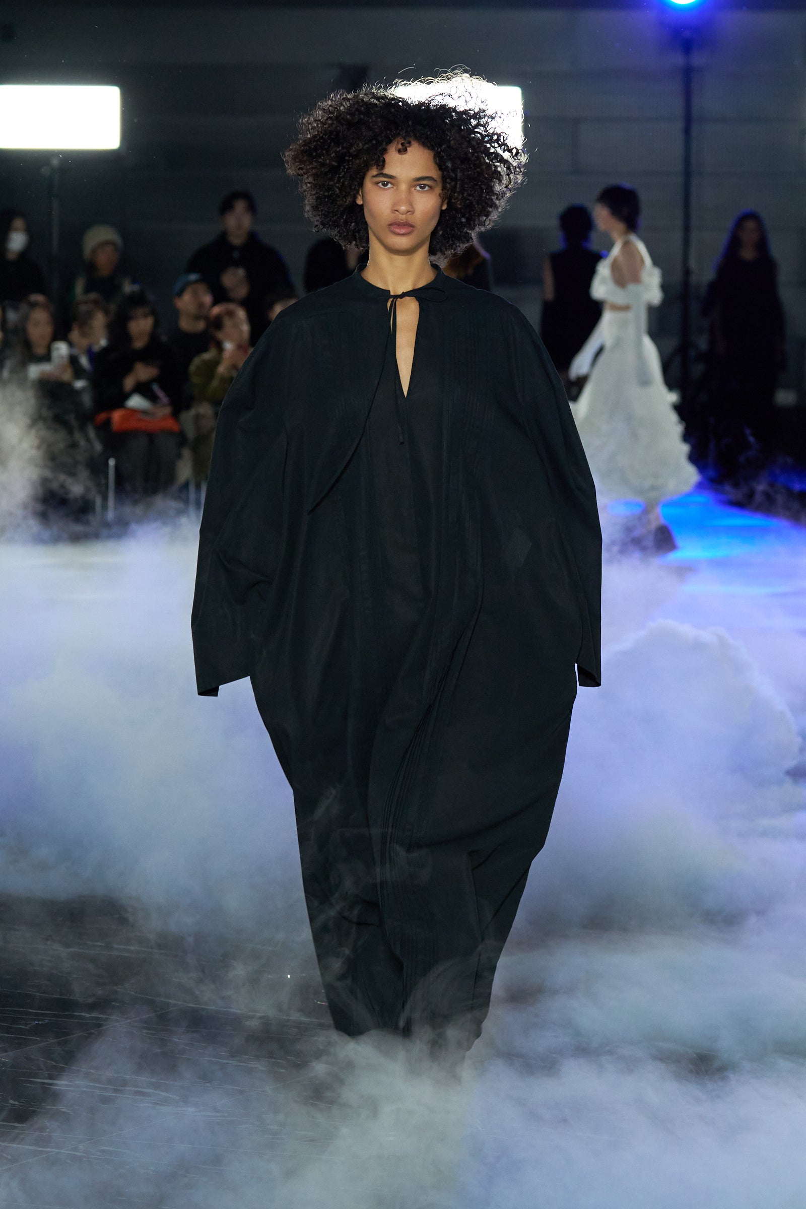 ランウェイでは、モノトーンから始まり、グレーやベージュのワントーン、モンスターを想起させるファーアイテム、惑星をモチーフにセレクトされたプリント、シルバー箔を施したドレスなど、幅広い素材と造形を展開。