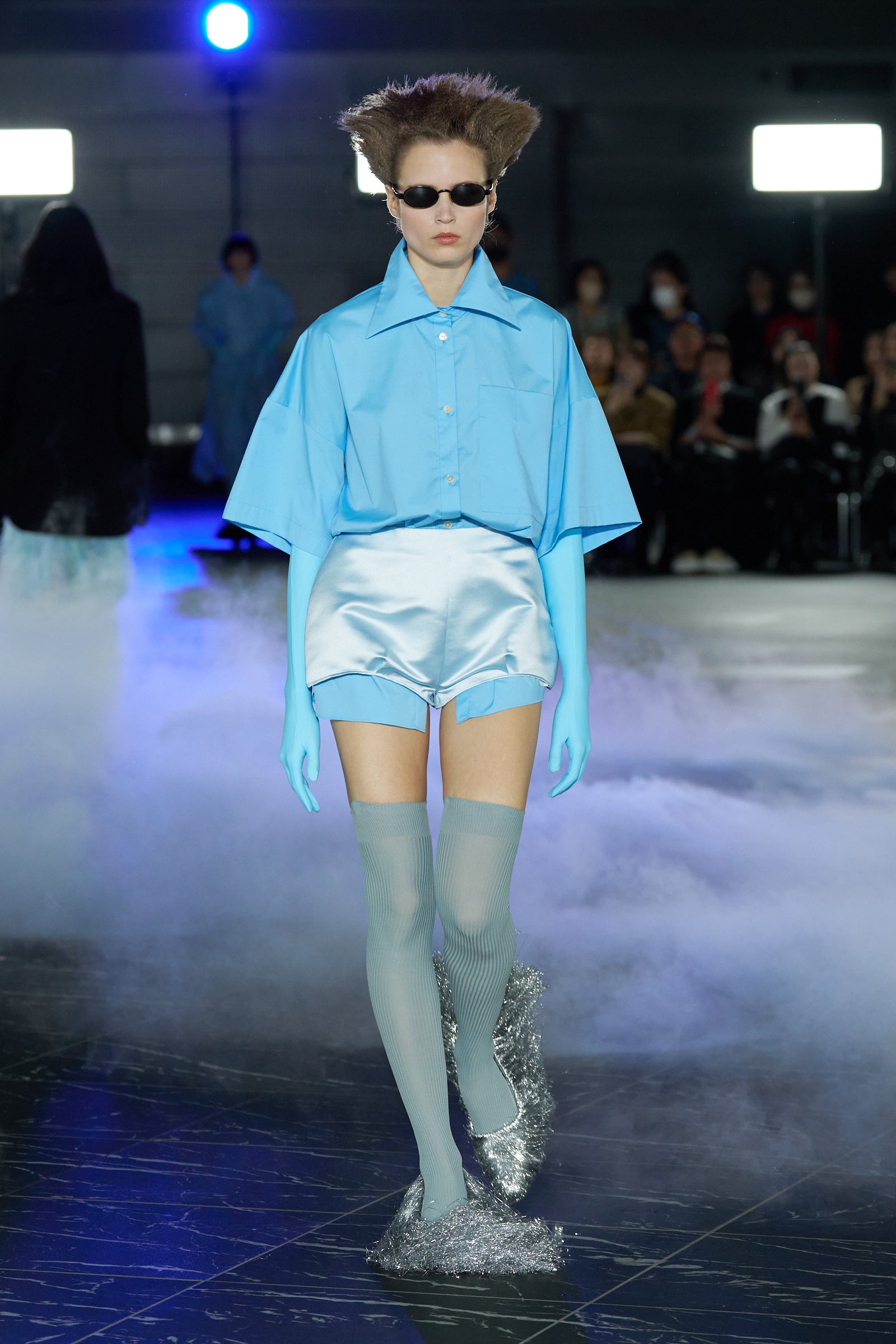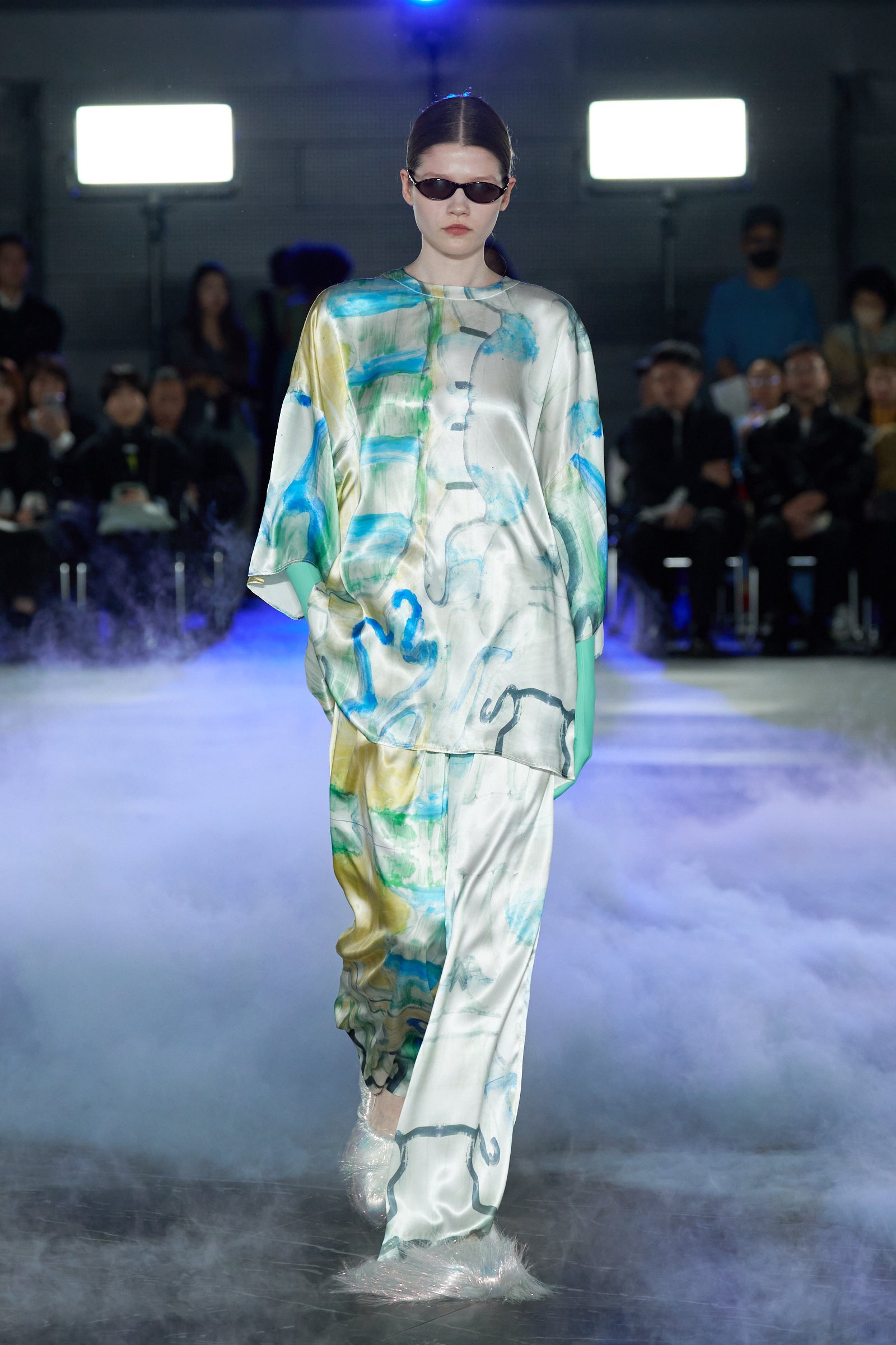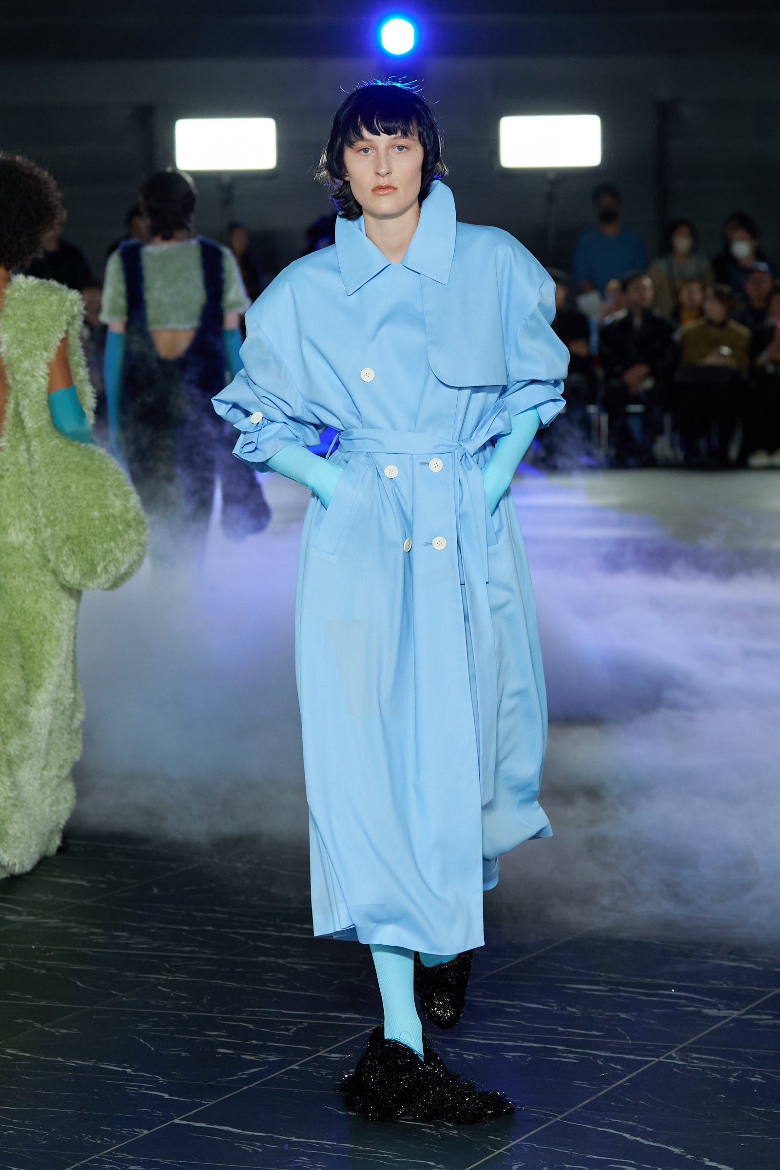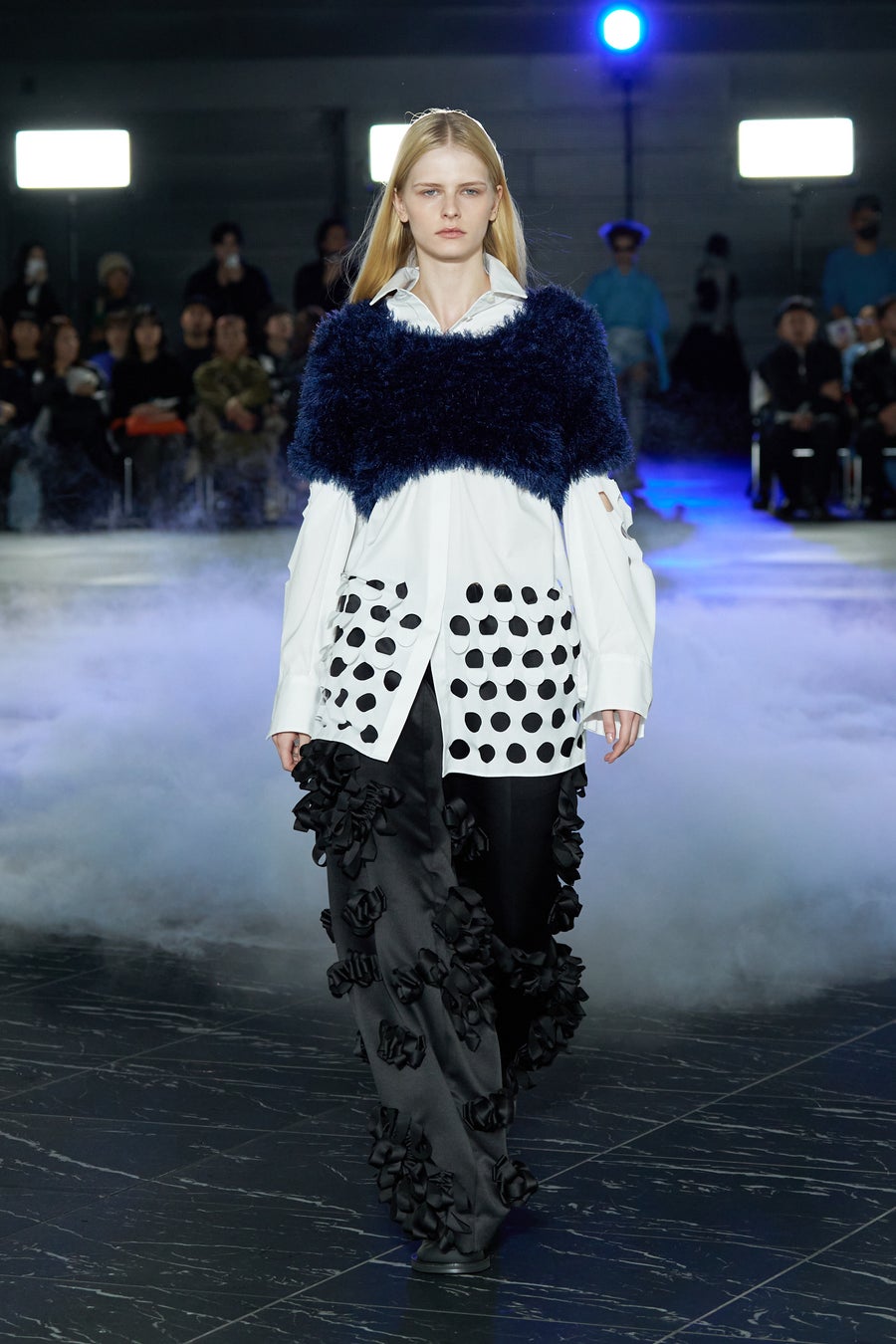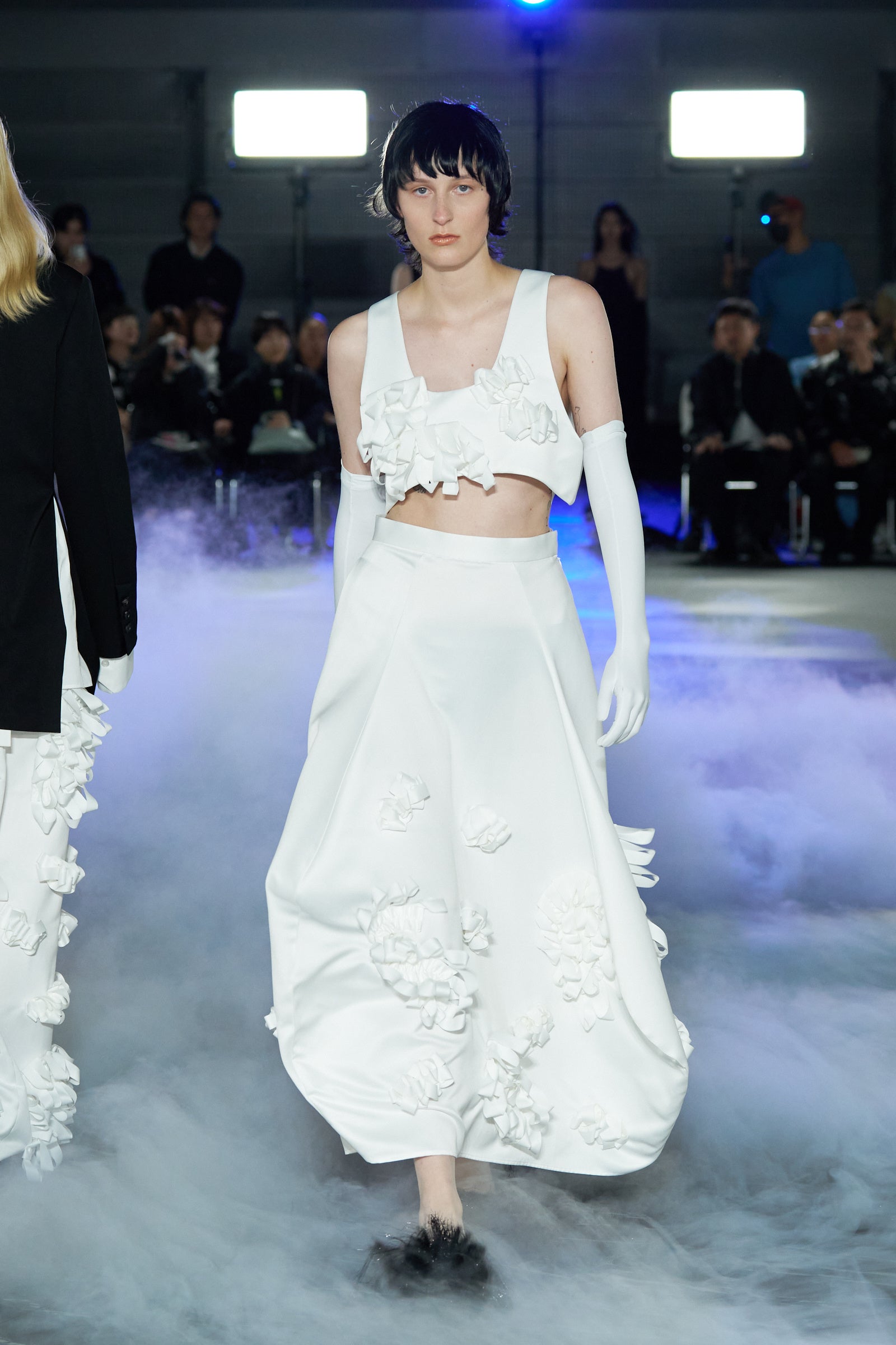 ランウェイでは、モノトーンから始まり、グレーやベージュのワントーン、モンスターを想起させるファーアイテム、惑星をモチーフにセレクトされたプリント、シルバー箔を施したドレスなど、幅広い素材と造形を展開。