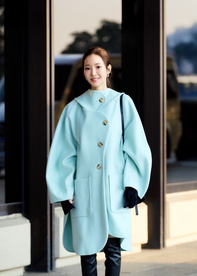 空港では、遊び心のある爽やかなライトグリーンのモッズコートをさらりと羽織り、リラックスしたスタイルで登場。ショー会場では、さまざまな形のお皿をモチーフにした個性的なシルエットのシャツに、ラインが印象的なベストをレイヤードしたスタイリングを披露。彼女らしい上品さを感じさせるルックで来場者の注目を集めました。