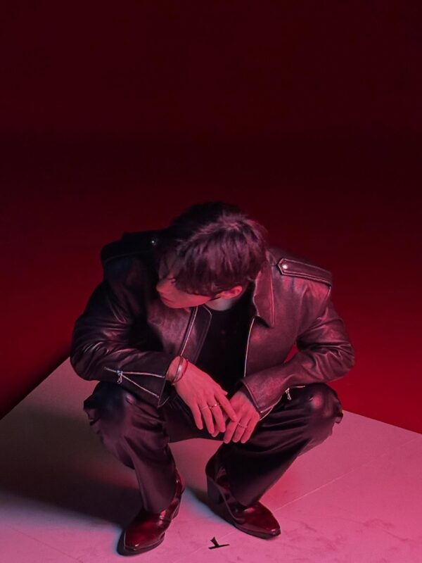 写真には、ブラックのタンクトップにレッドとブラックのレザーファンションを披露するVの姿が盛り込まれている。