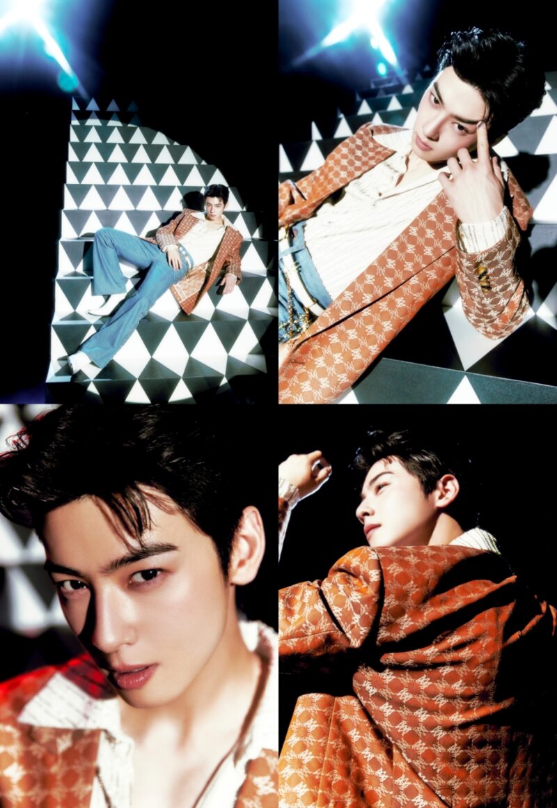 これに相反するムードの2番目のフォトは、チャウヌの華麗なオーラに意外性を与えた。トロピカルフルーツのパパイヤにそっくりなオレンジのジャケットで、一層鮮やかな個性をアピールしたチャウヌは、ライトの照明の下でスタンドマイクとギターを活用したポーズで、まるでパーティーのワンシーンのような感覚的な雰囲気を完成した。