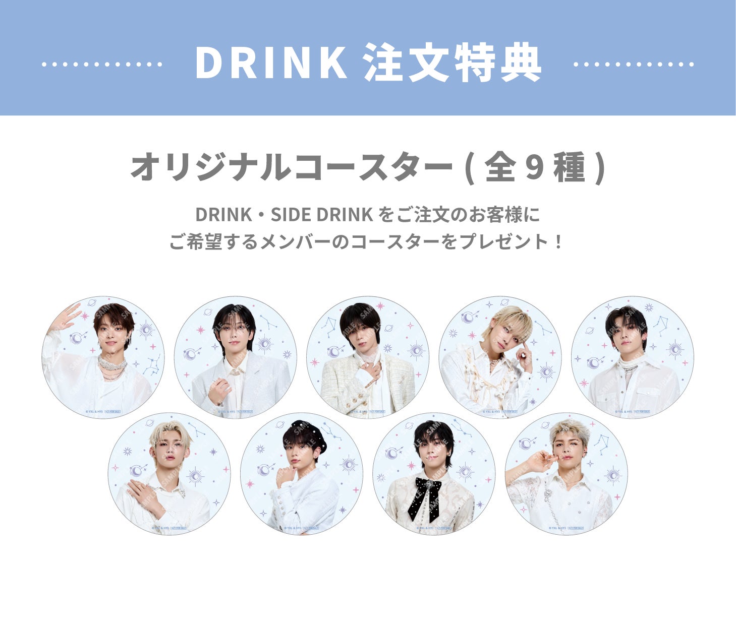 ■DRINK注文特典:CAFEでドリンクメニューをご注文された方にご希望するメンバーの「オリジナルコースター(全9種)」を1品につき1枚プレゼント。