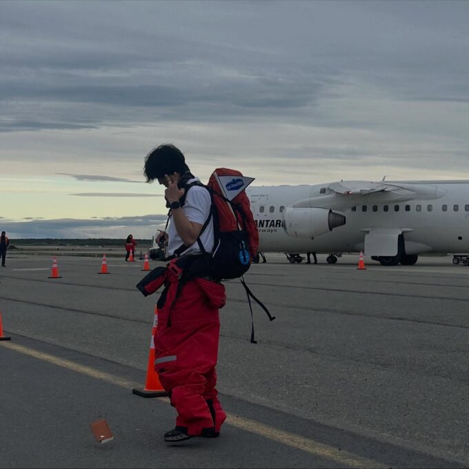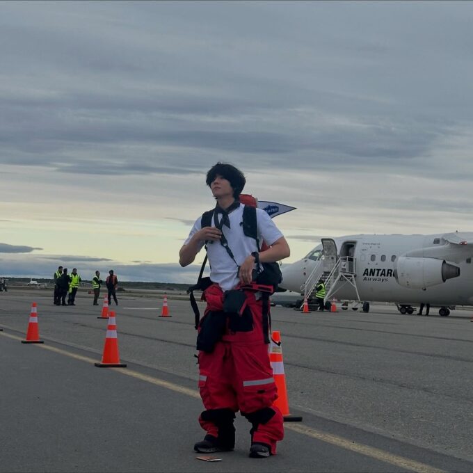 チェ・ジョンヒョプは空港の一角に立ってカメラに向かってピースをしている。