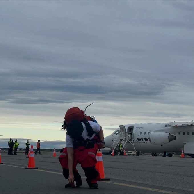 彼は風が吹く中で大きなナップサックを背負ってたくましい姿を見せている。