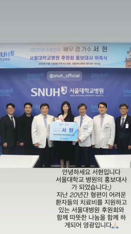 ソヒョンは19日、自身のInstagram Storiesに「ソウル大学病院の広報大使に就任した」とし、「過去20年間、経済的に困難な患者の治療費を支援しているソウル大病院後援会と共にあたたかい分かち合いを共にできることを光栄に思う」とコメントしました。