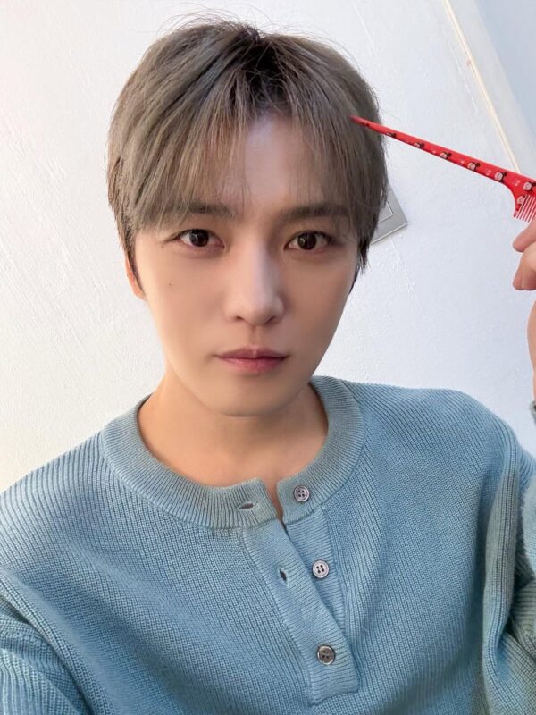 写真には ライトブルーのニットを着たジェジュンの姿が収められている。ジェジュンは櫛を頭に当ててキョトンとした表情をしている。ジェジュンの爽やかなビジュアルに視線が集まる。